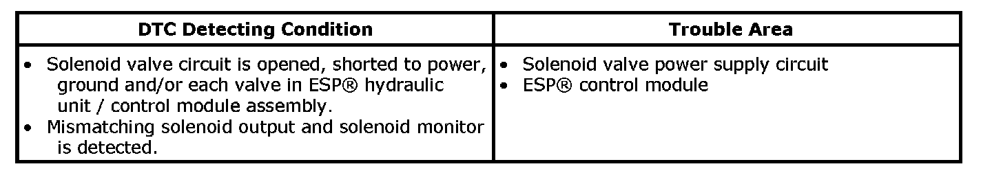 DTC C1041 / C1042 / C1043 / C1044 / C1045 / C1046 / C1051 / C1052 / C1053 / C1054 / C1055 / C1056: Inlet / Outlet / Cut Suction Solenoid Valve Circuit Failure(DTC C1041 / C1045 C1051 / C1055: Right-Front / Left-Front / Right-Rear / Left-Rear Inlet Solenoid)