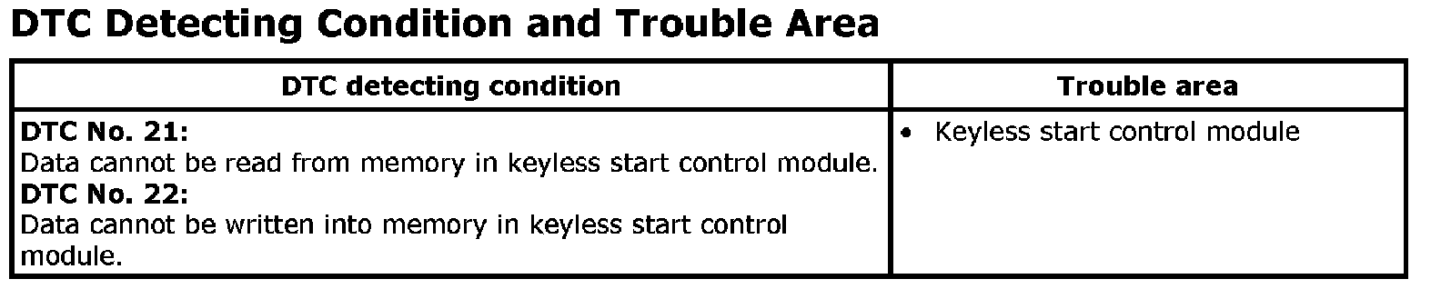 DTC No. 21 / 22: Internal Error Of Keyless Start Control Module (EEPROM Reading Error) / (EEPROM Writing Error)DTC Detecting Condition and Trouble Area