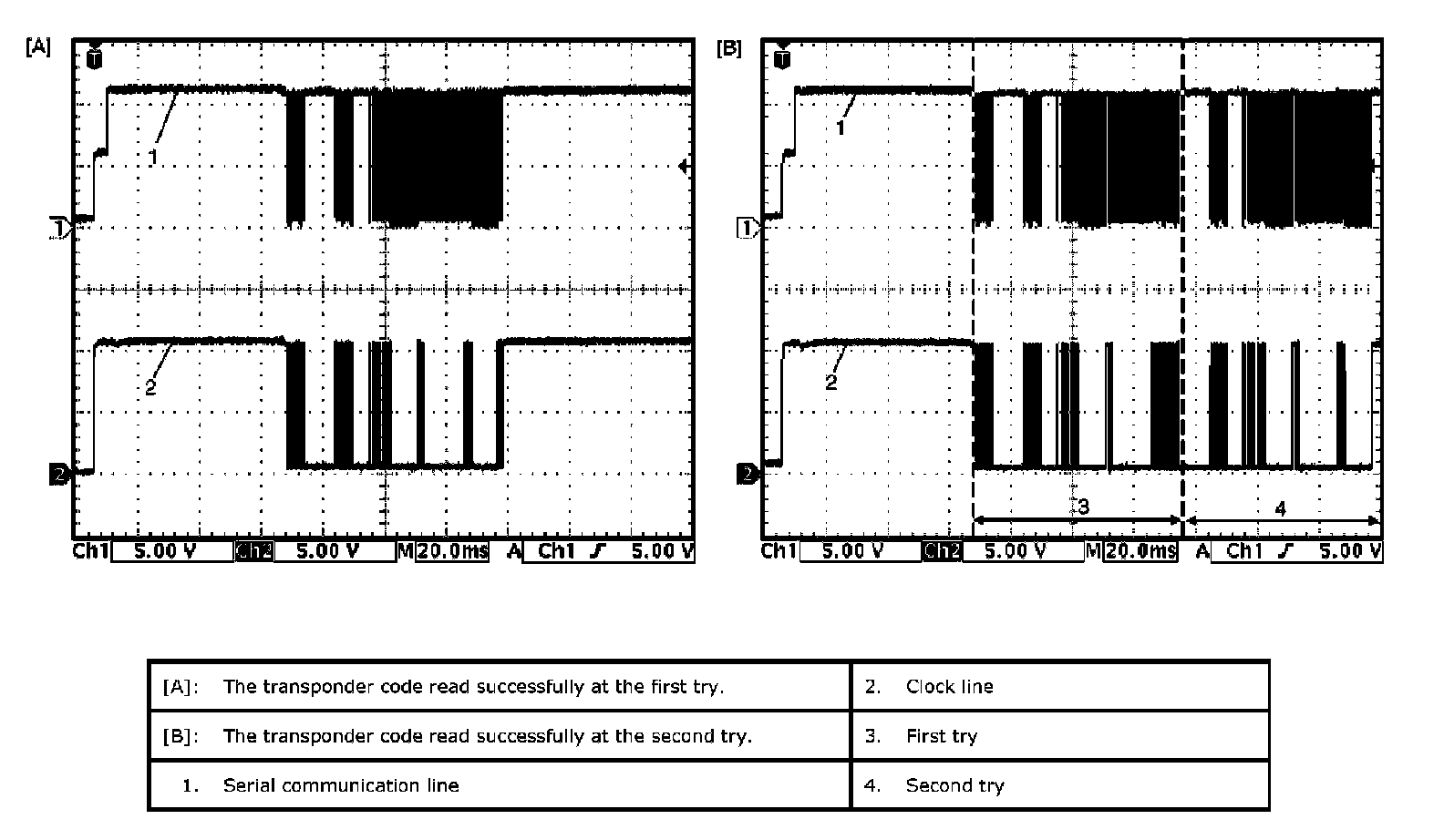 NOTE: When ECM cannot read the transponder code at the first try, ECM tries to read the transponder code repeatedly up to 8 times. The second waveform is the example showing that ECM read the transponder code successfully at the second try.