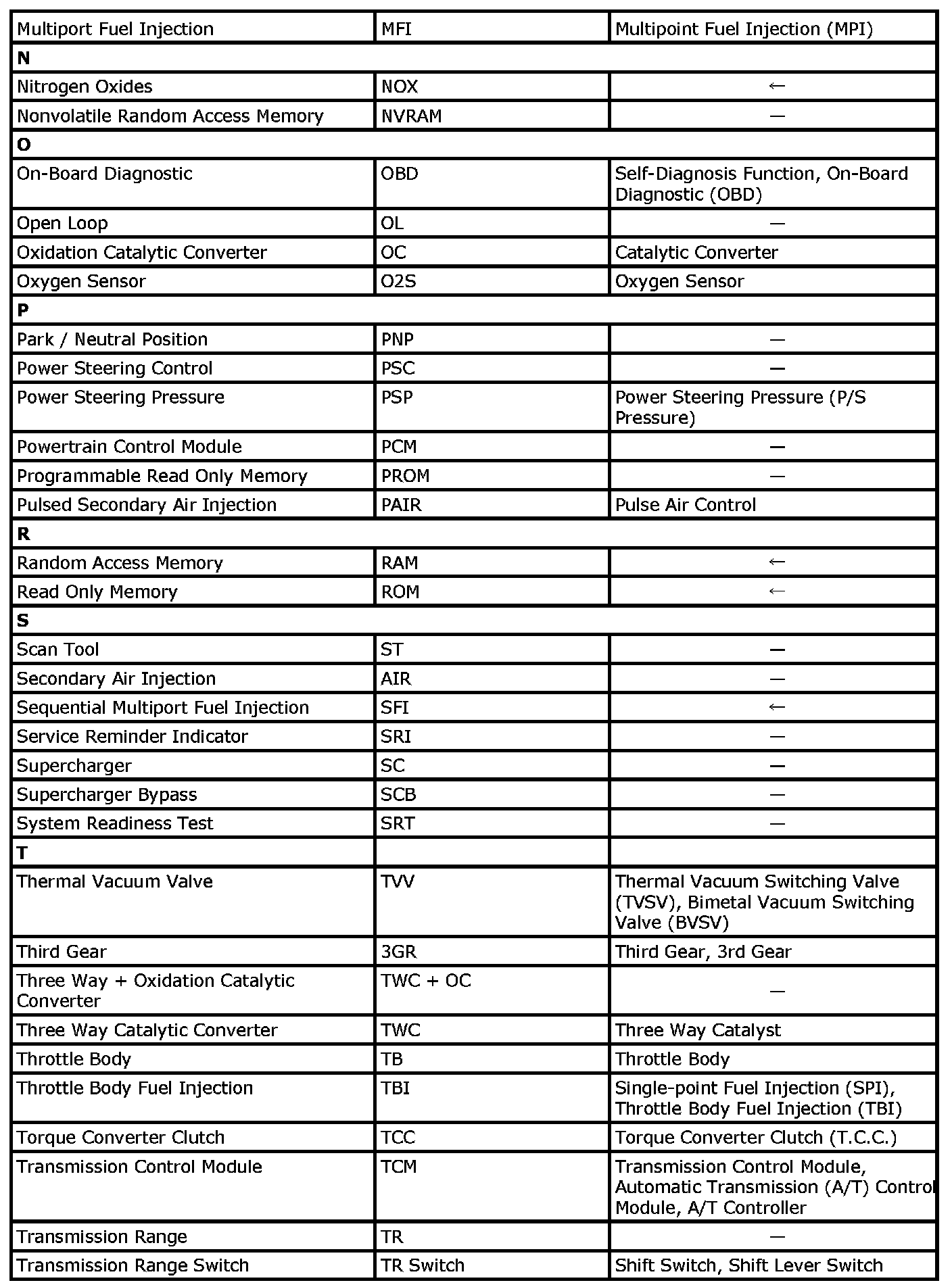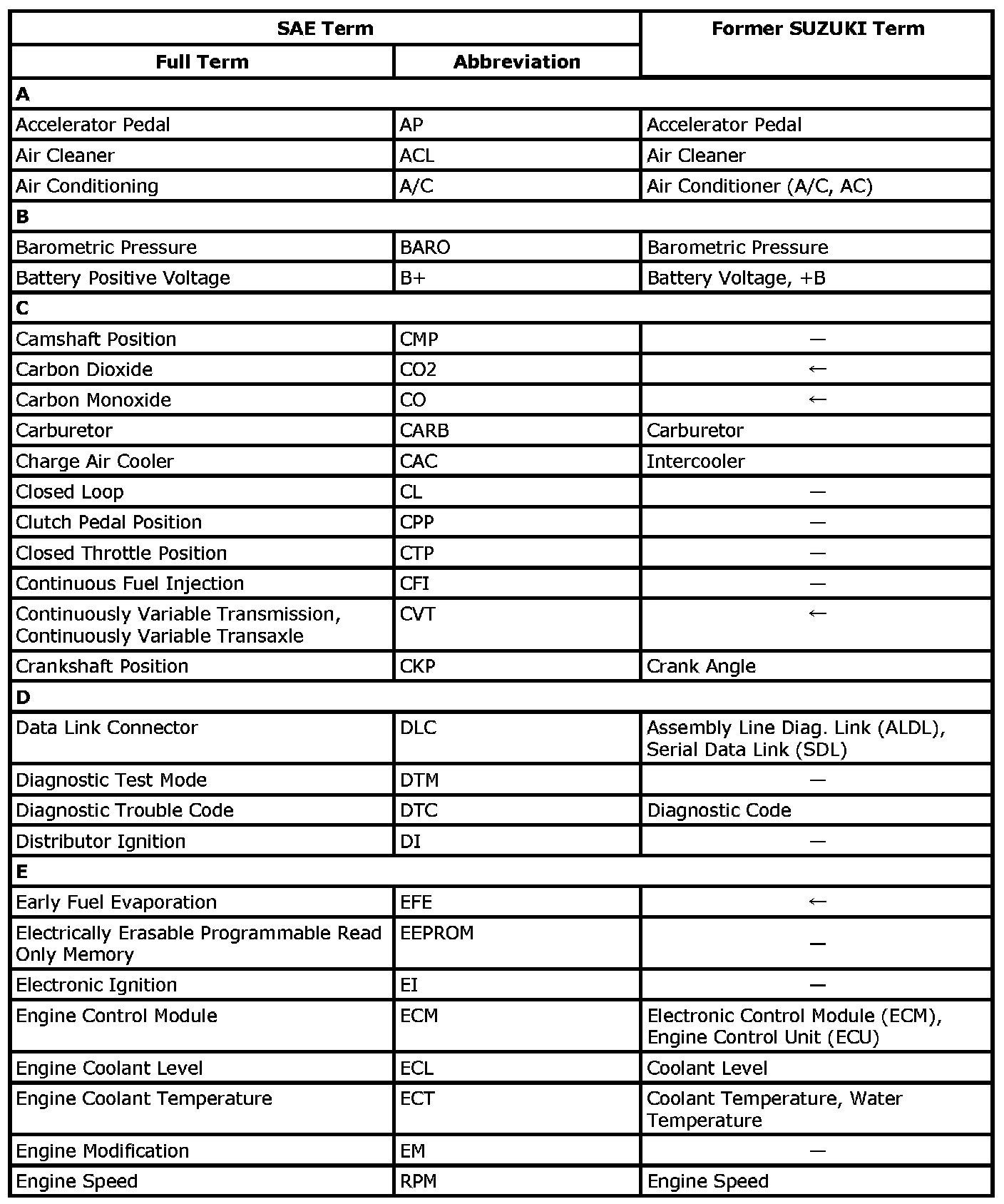 This table lists SAE (Society of Automotive Engineers) J1930 terms and abbreviations in compliance with SAE recommendations, as well as their former SUZUKI names.