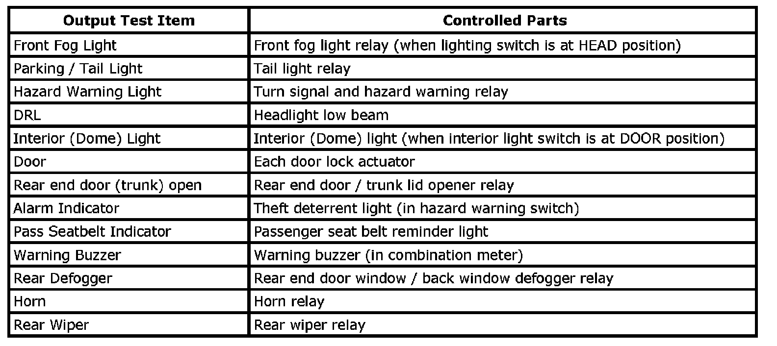 SUZUKI scan tool has the output test function which can force operation of following actuators and relays of the system controlled by BCM. When a malfunction is found in the system controlled by BCM, execute the output test which enables easy judgment whether the malfunction is on the input side or output side of BCM. For detailed information on operation of SUZUKI scan tool, refer to "SUZUKI Scan Tool Operator's Manual".