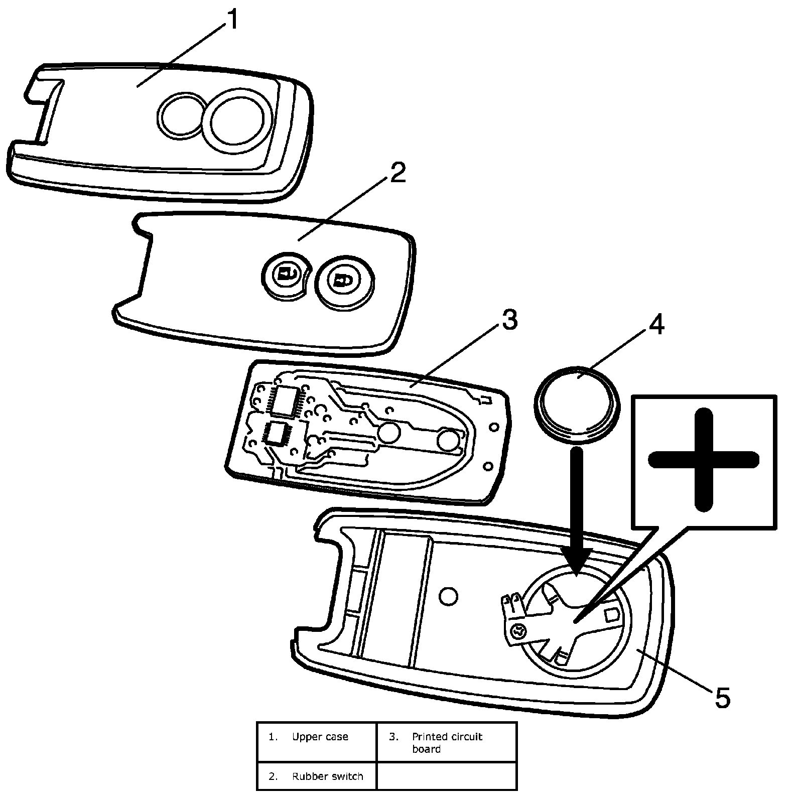 5. Install printed circuit board and rubber switch to upper case and then fit lower case securely.
