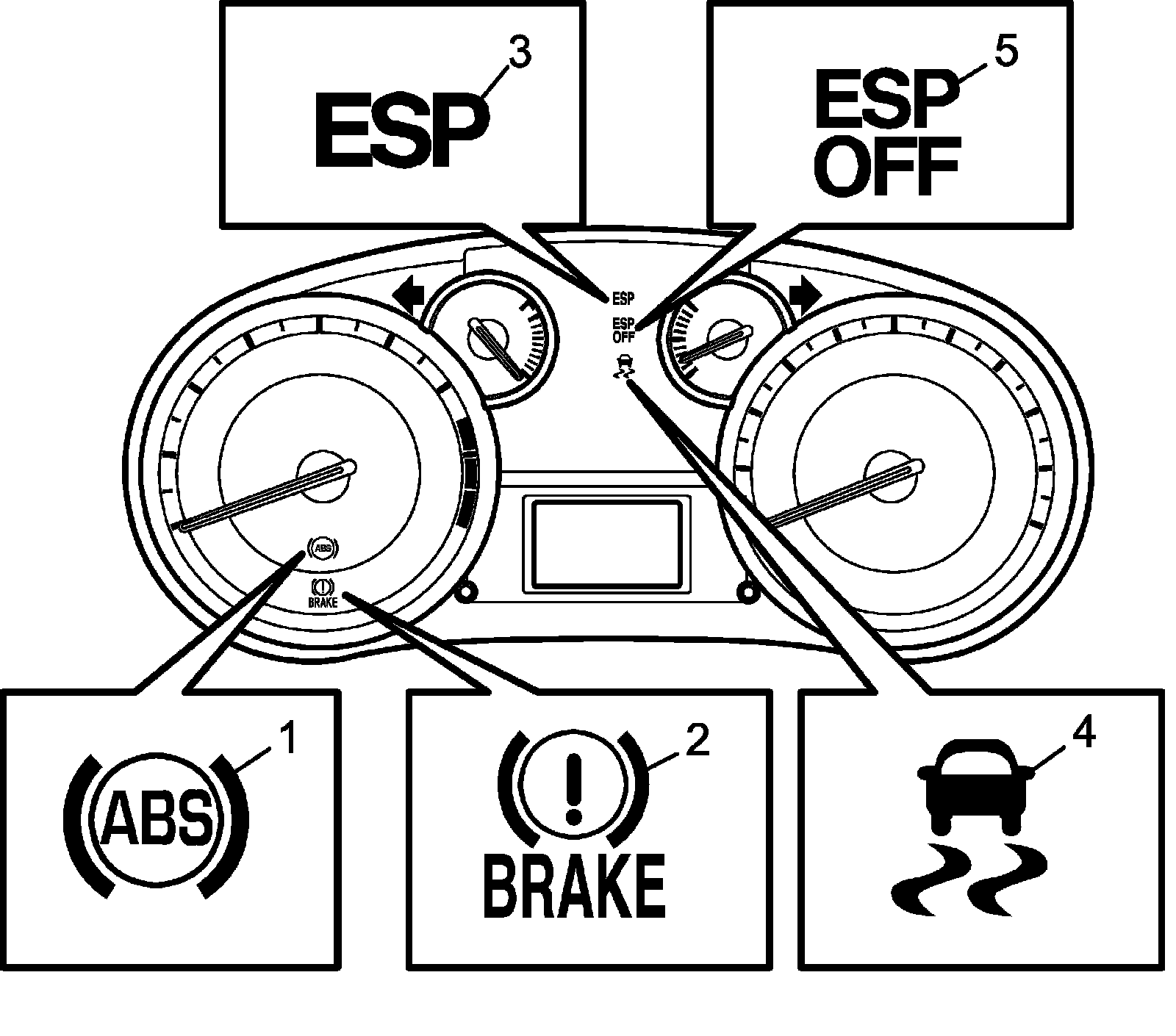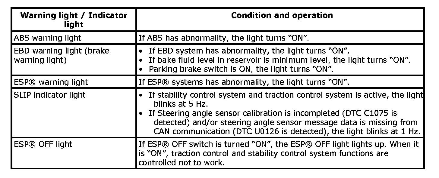 Warning Light, Indicator Light DescriptionThere are five types of warning light and indicator light in instrument cluster, which are controlled by ESP(R) control module. They give warning / indication to driver by changing the modes light ON / blinking / light OFF.