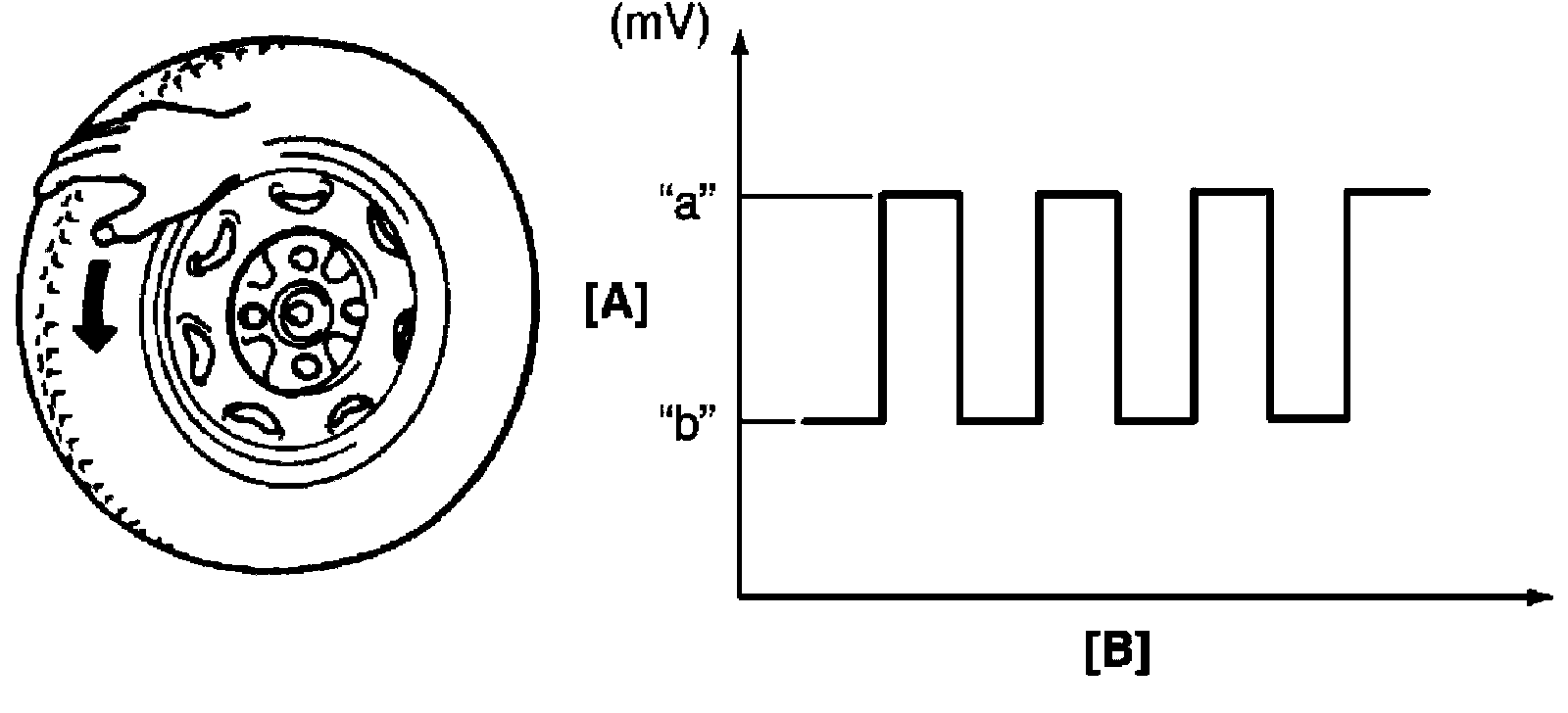 6) Measure voltage at resistance with wheel rotation and confirm voltage alternately changes between high and low voltages. If voltage does not change with wheel rotation, check sensor, mating encoder and their installation conditions.