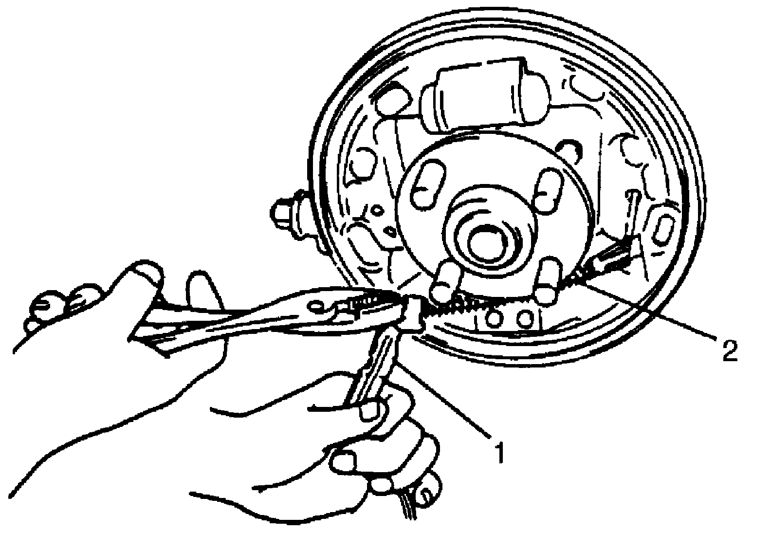 4) Disconnect parking brake shoe lever (1) from parking brake cable (2).