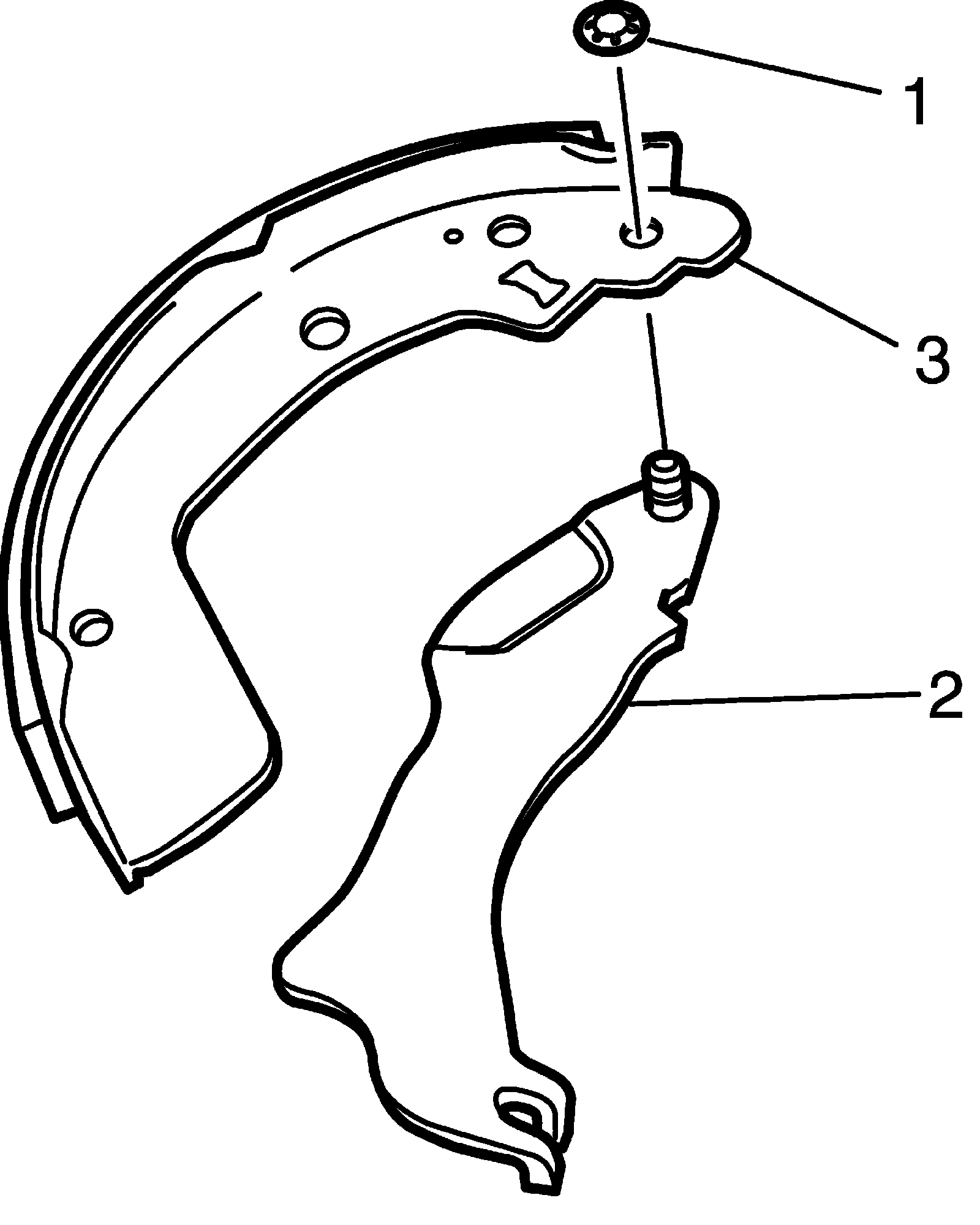 5) Remove push nut (1). 6) Remove parking brake shoe lever (2) from shoe rim (3).