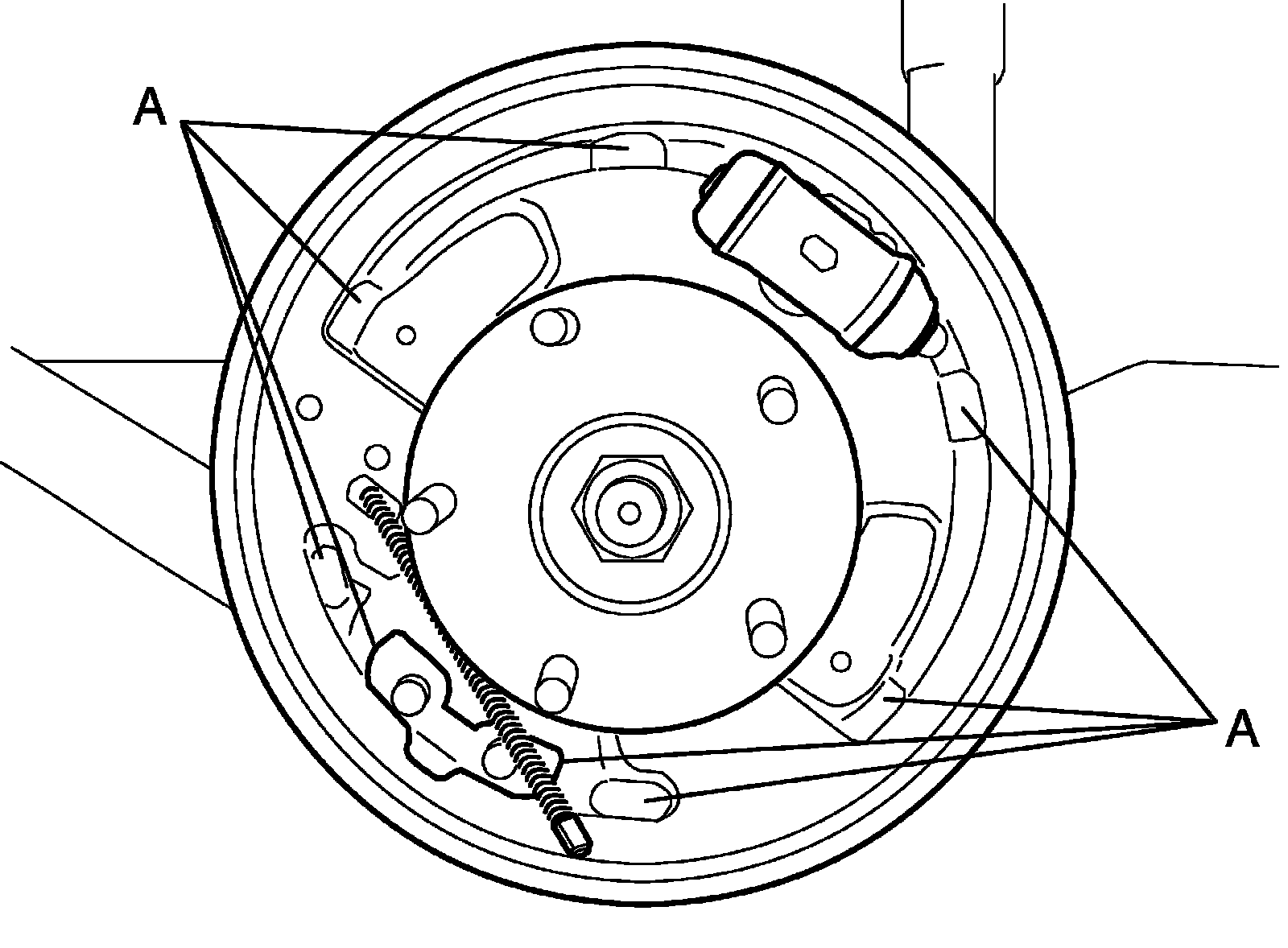 3) Remove return springs, brake shoes and adjuster.