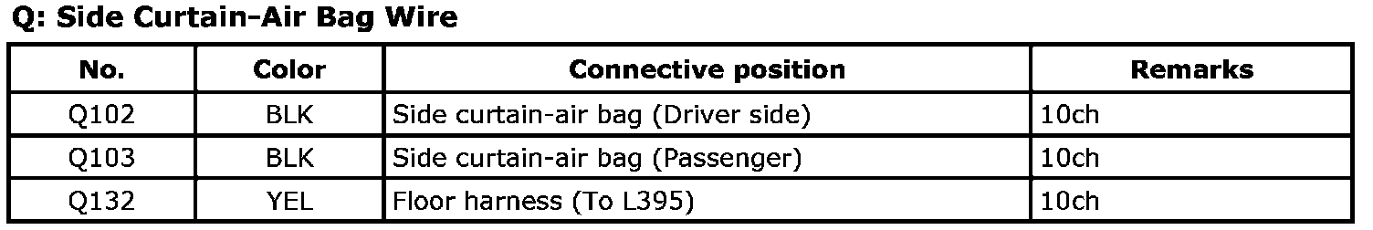 FloorL: Floor Harness, Coupling Harness, Seat Sensor (R) Wire, Seat Sensor (L) Wire / Q: Side Curtain-Air Bag Wire, Side-Air Bag (Driver Side) Harness, Side-Air Bag (Passenger Side) Harness / R: Fuel Pump Wire (Hatchback Model)L: Floor Harness, Coupling Harnes, Seat Sensor (R) Wire, Seat Sensor (L) Wire / Q: Side Curtain-Air Bag Wire, Side-Air Bag (Driver Side) Harness, Side-Air Bag (Passenger Side) Harness / R: Fuel Pump Wire (Hatchback Model):