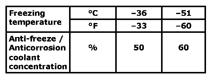 ^ Maintain cooling system freeze protection at -36°C (-33°F) to ensure protection against corrosion and loss of coolant from boiling. This should be done even if freezing temperatures are not expected.