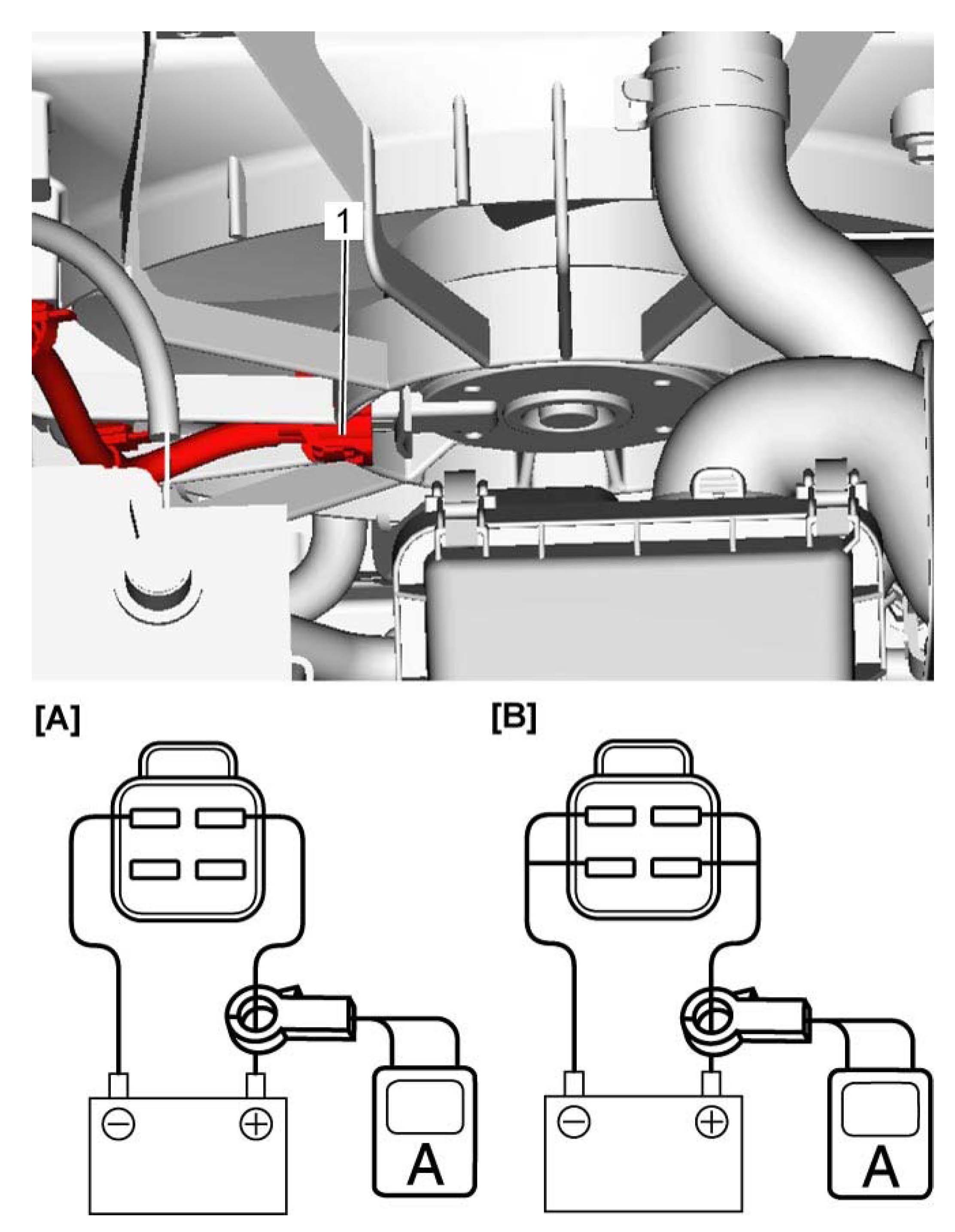 2) Using service wire, connect radiator cooling fan motor connector and battery as shown in figure.