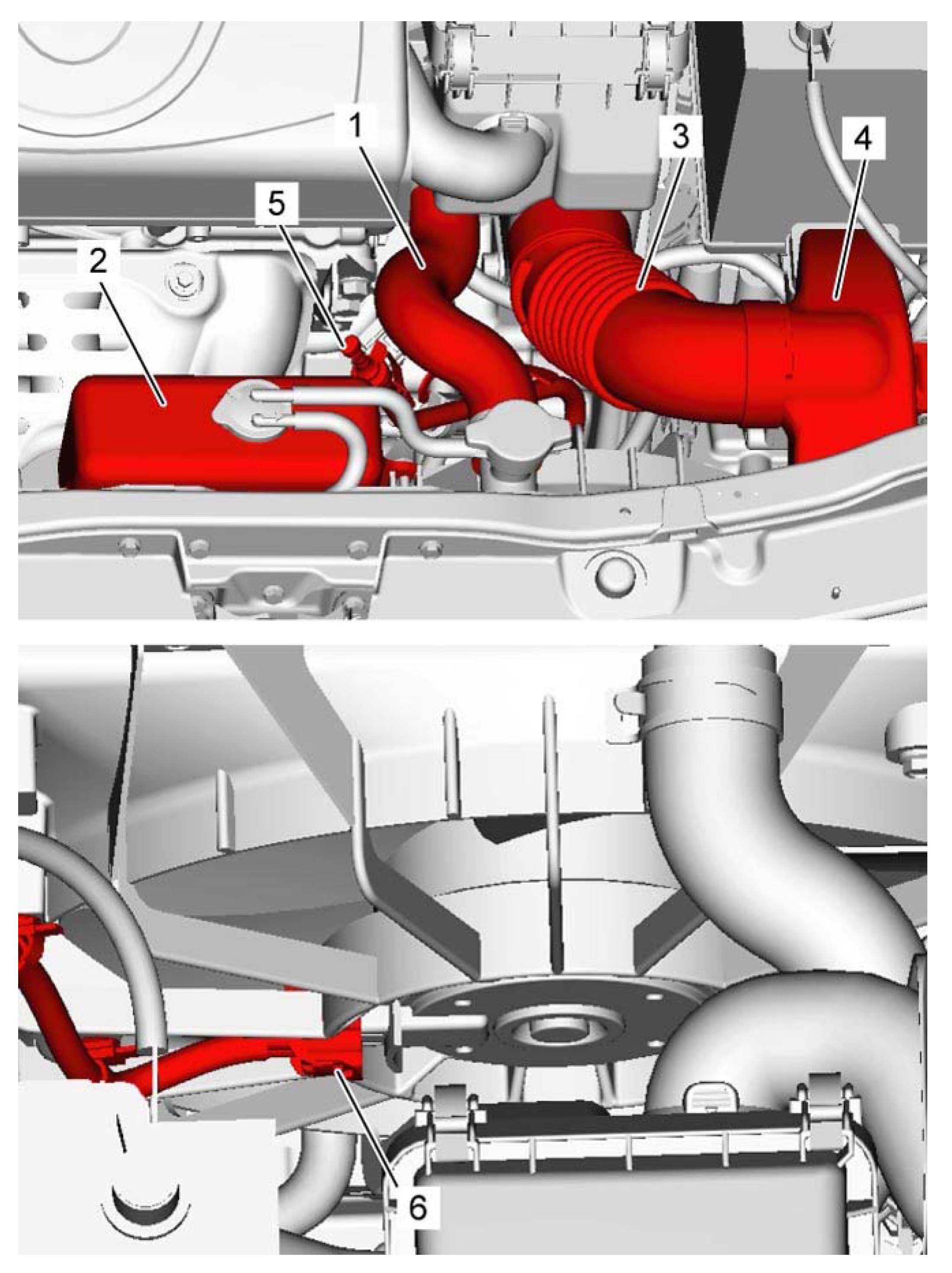 3) Remove radiator inlet hose (1), reservoir (2), air suction hose (3), air cleaner suction pipe (4), fluid level gauge and fluid level gauge guide (CVT model) (5).
