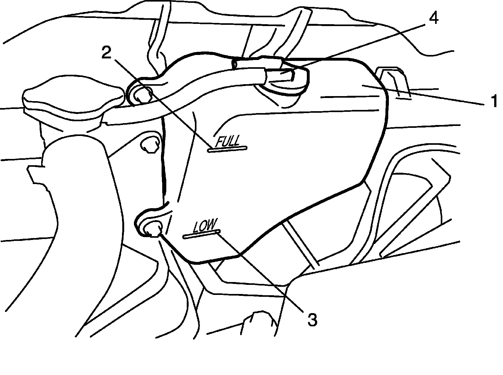 A normal coolant level should be between FULL mark (2) and LOW mark (3) on reservoir (1). If coolant level is below LOW mark (3), remove reservoir cap (4) and add proper coolant to reservoir to bring coolant level up to FULL mark (2).