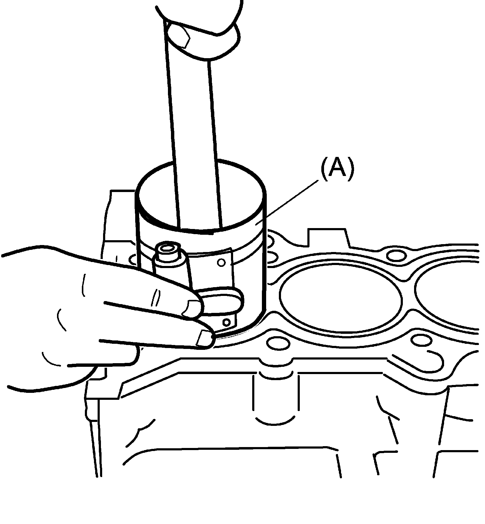 Using a hammer handle, tap piston head to install piston into bore. Hold ring compressor firmly against cylinder block until all piston rings have entered in cylinder bore.