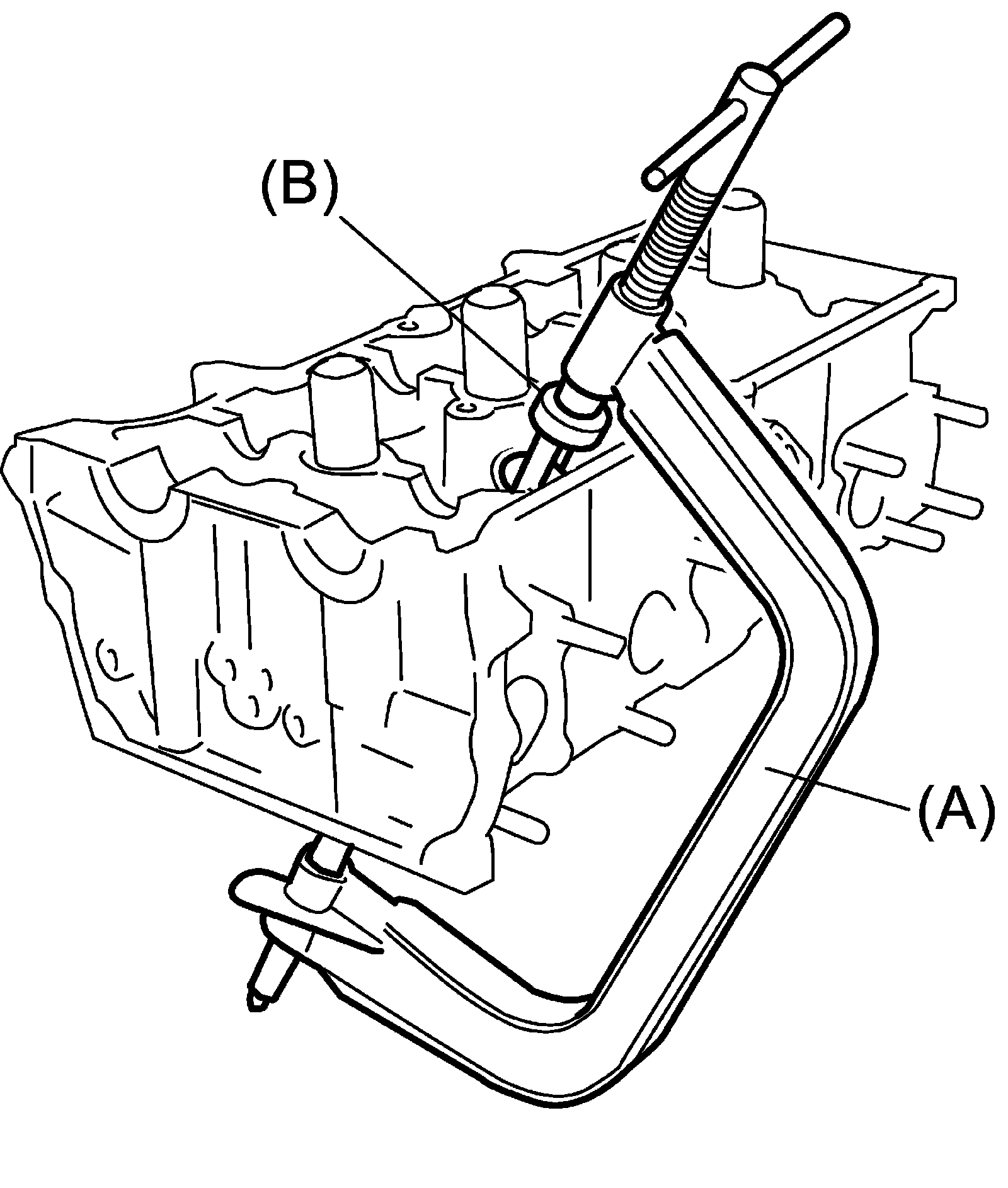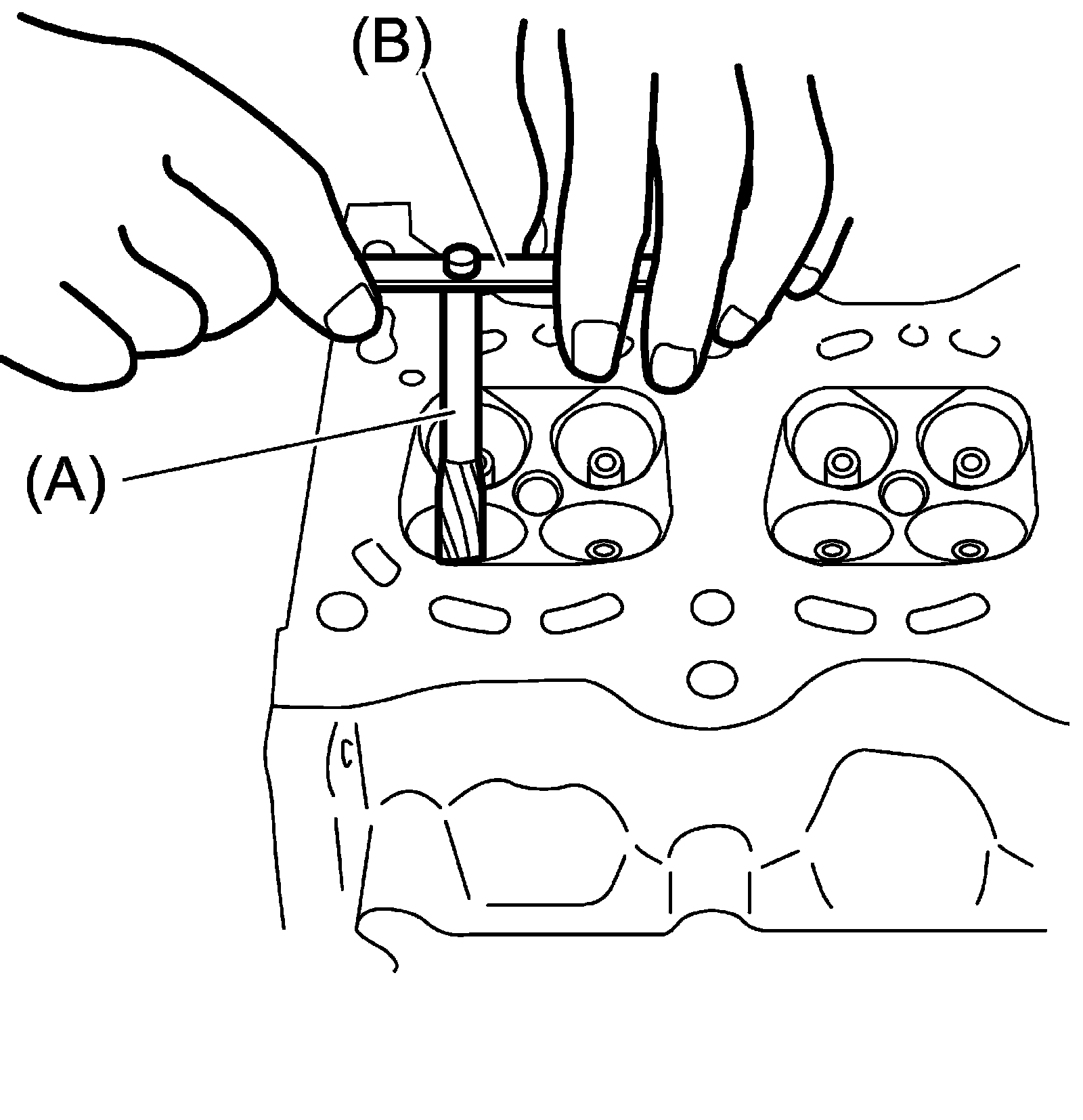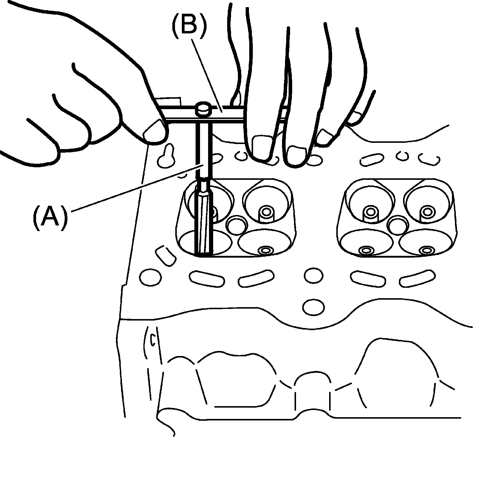 4) Release special tools (A) and (B), and remove spring retainer and valve spring.