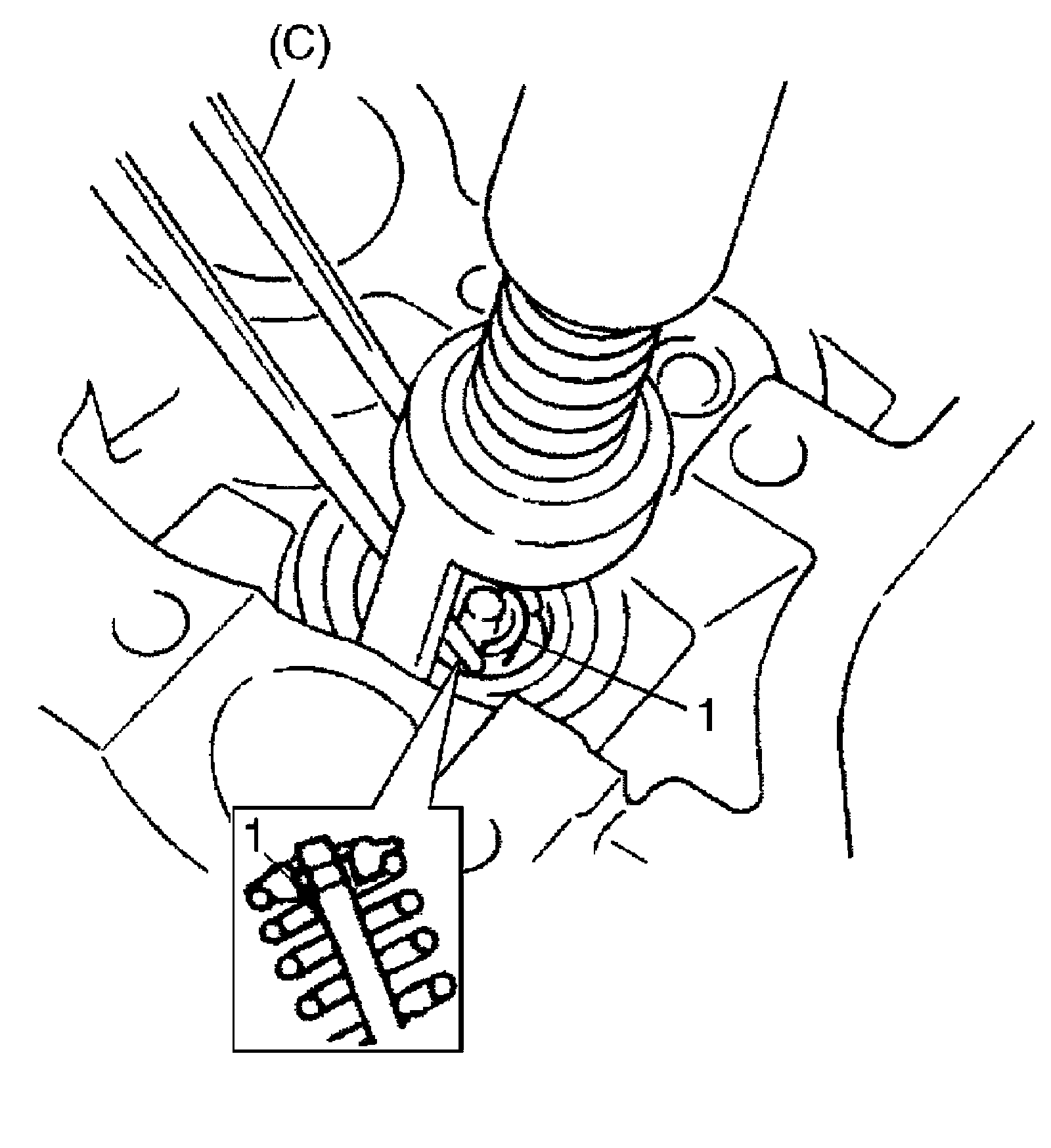 9) Using special tools, compress valve spring and fit two valve cotters (1) into groove in valve stem.