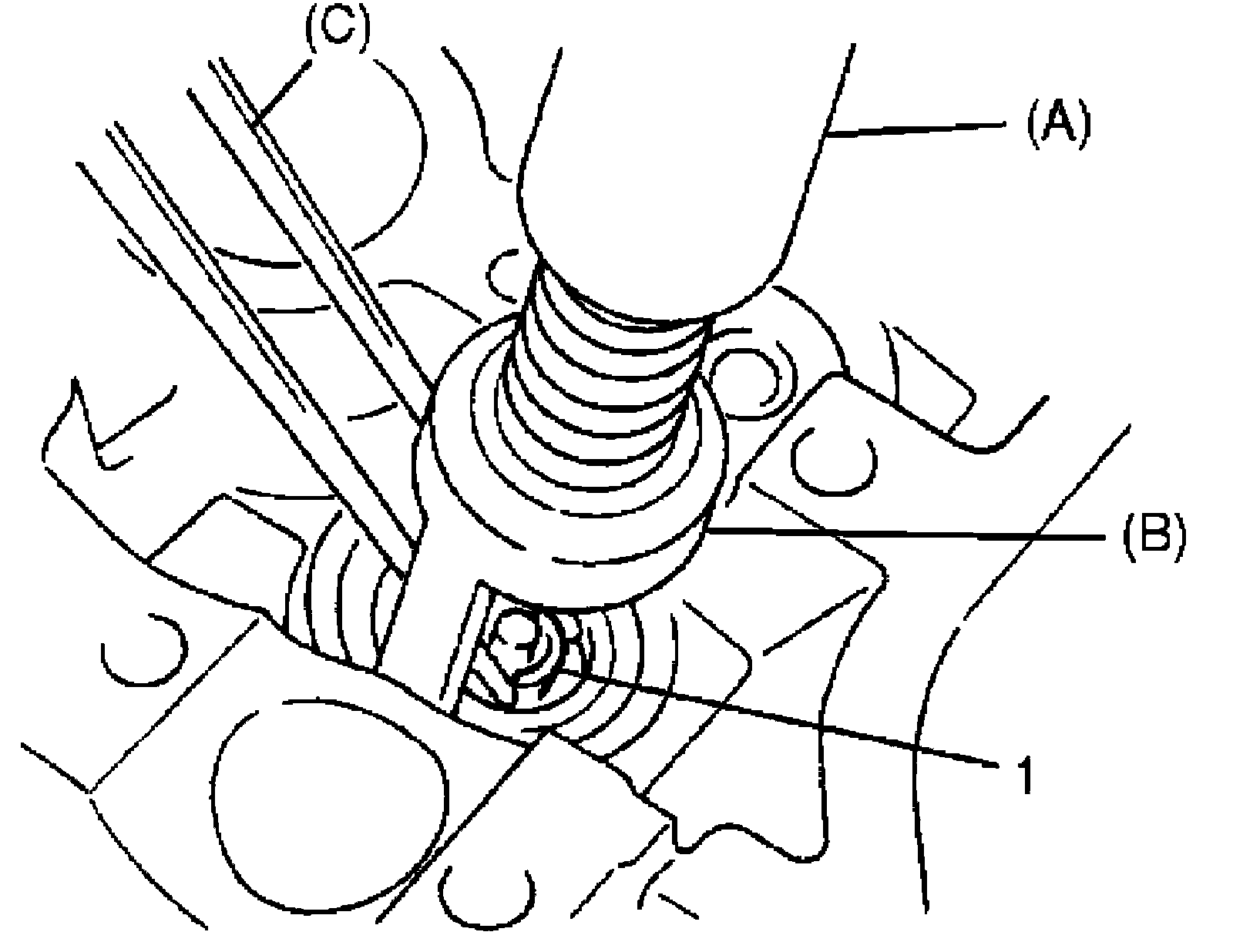 3) Using special tools (A) and (B), compress valve spring and then remove valve cotters (1) also by using special tool (C).