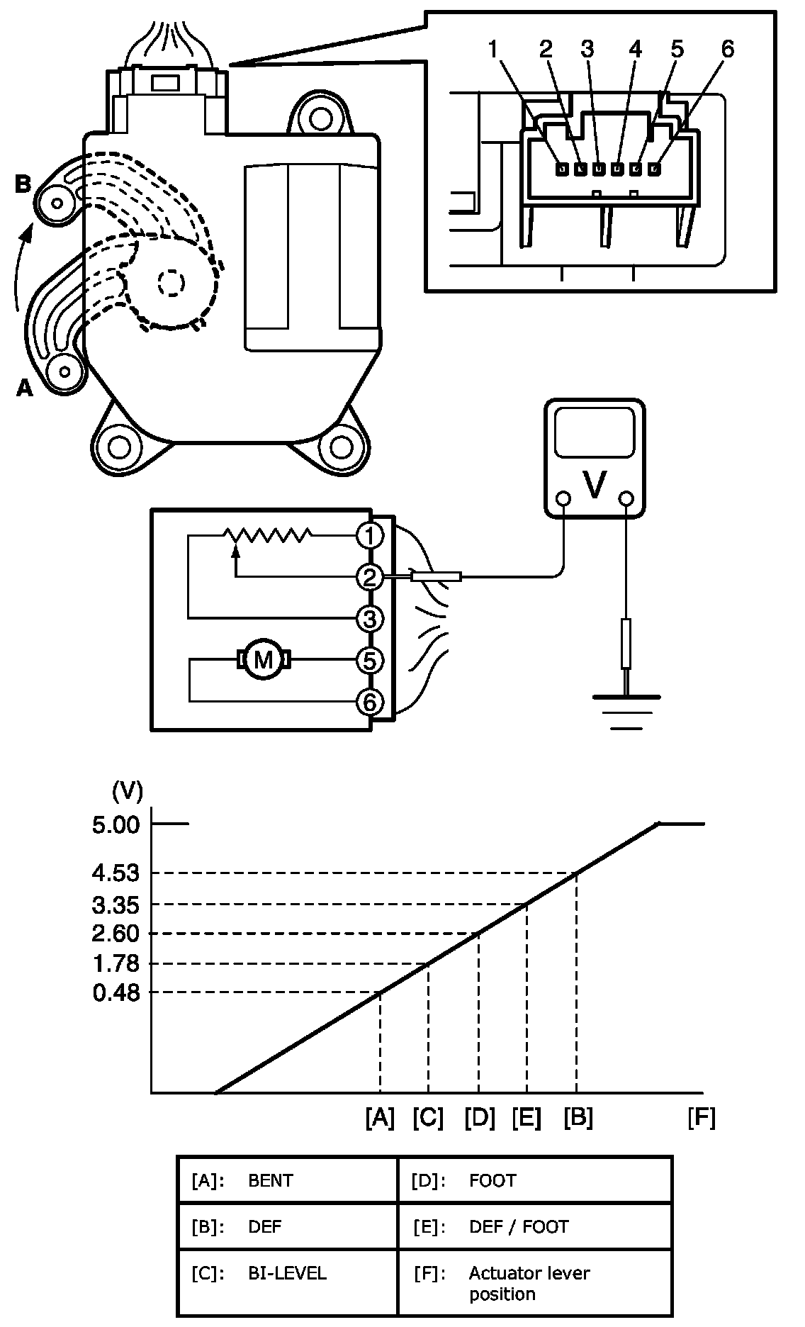 6. Measure output voltage variation while air flow control actuator is operated from "BENT" position (A) to "DEF" position (B) as following specification.