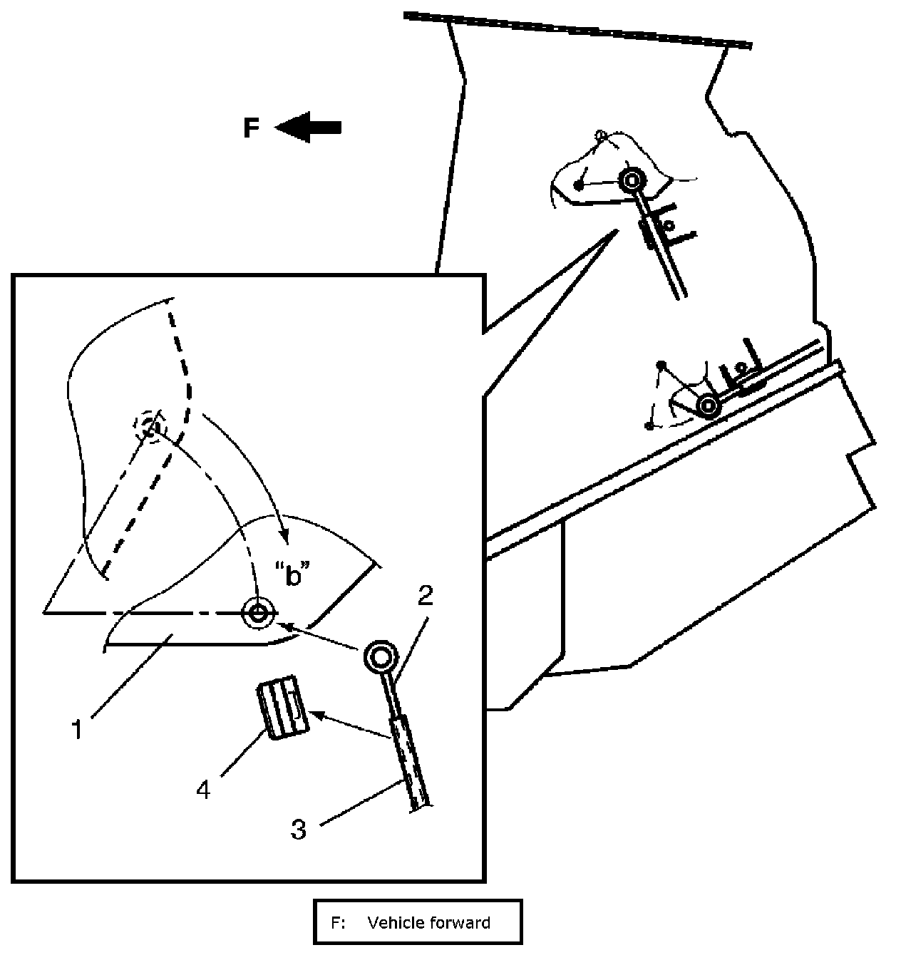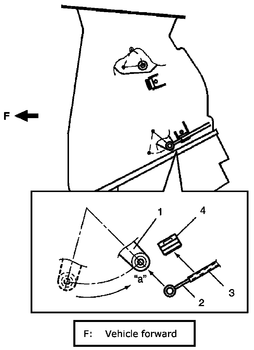 c. Move air flow control plate (1) to "DEF" position "b", then fix air flow control inner cable (2) to pin of air flow control plate and fix outer cable (3) to cable lock clamp (4).