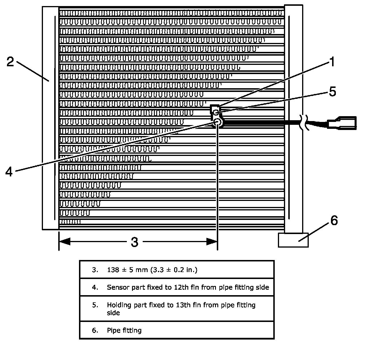 - Install evaporator temperature sensor (1) onto evaporator (2) as shown.