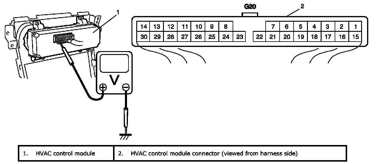 HVAC control module and its circuits can be checked by measuring terminal voltages of HVAC control module connector.