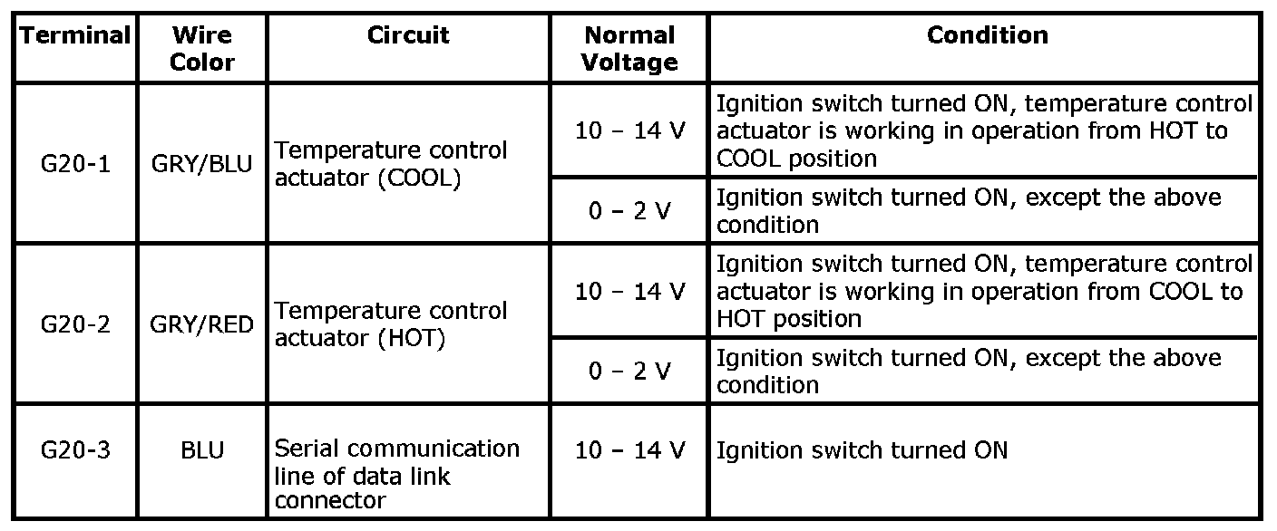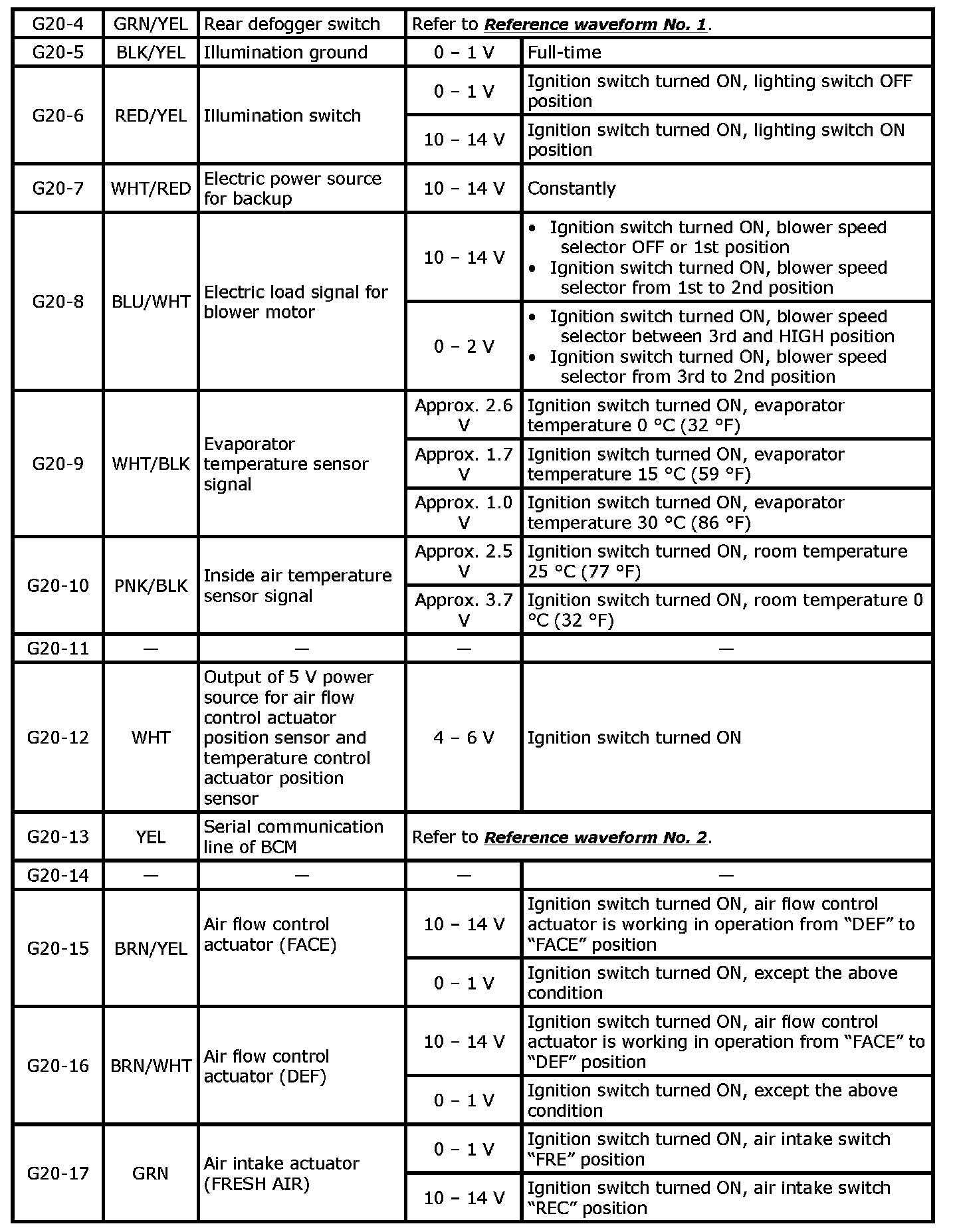 NOTE: As each terminal voltage is affected by the battery voltage, confirm that the battery voltage is 11 V or more when ignition switch is ON.