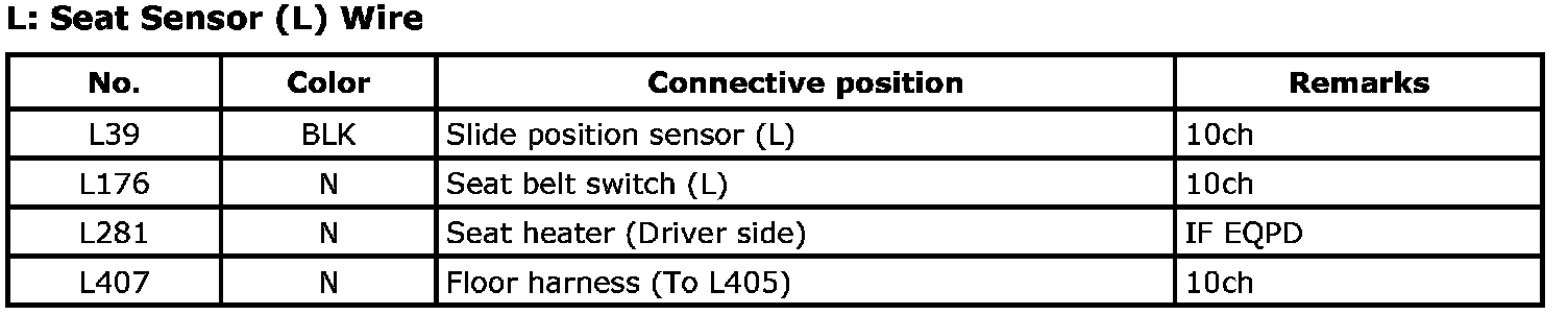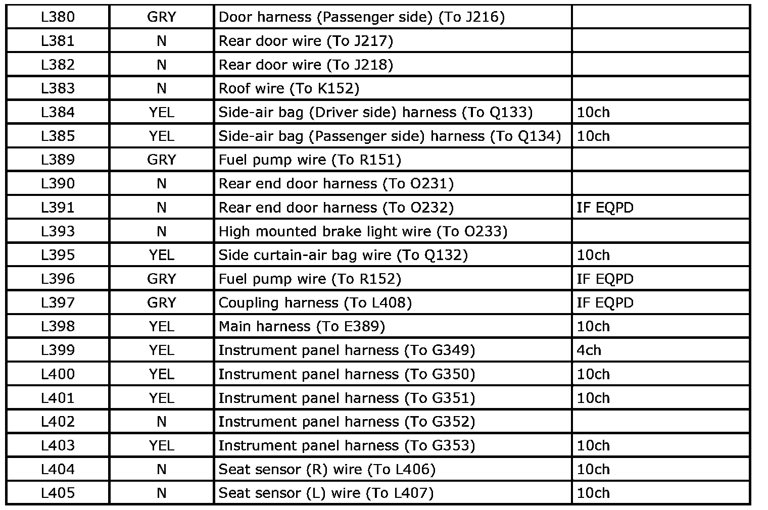 Floor L: Floor Harness, Coupling Harness, Seat Sensor (R) Wire, Seat Sensor (L) Wire / Q: Side Curtain-Air Bag Wire, Side-Air Bag (Driver Side) Harness, Side-Air Bag (Passenger Side) Harness / R: Fuel Pump Wire (Hatchback Model)L: Floor Harness, Coupling Harnes, Seat Sensor (R) Wire, Seat Sensor (L) Wire / Q: Side Curtain-Air Bag Wire, Side-Air Bag (Driver Side) Harness, Side-Air Bag (Passenger Side) Harness / R: Fuel Pump Wire (Hatchback Model):