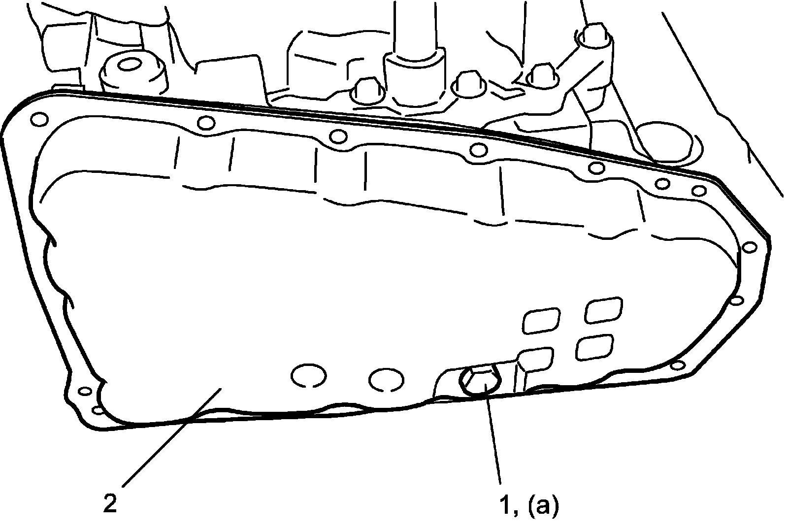 2) When engine is cool, remove CVT fluid drain plug (1) from CVT oil pan (2) and drain CVT fluid.