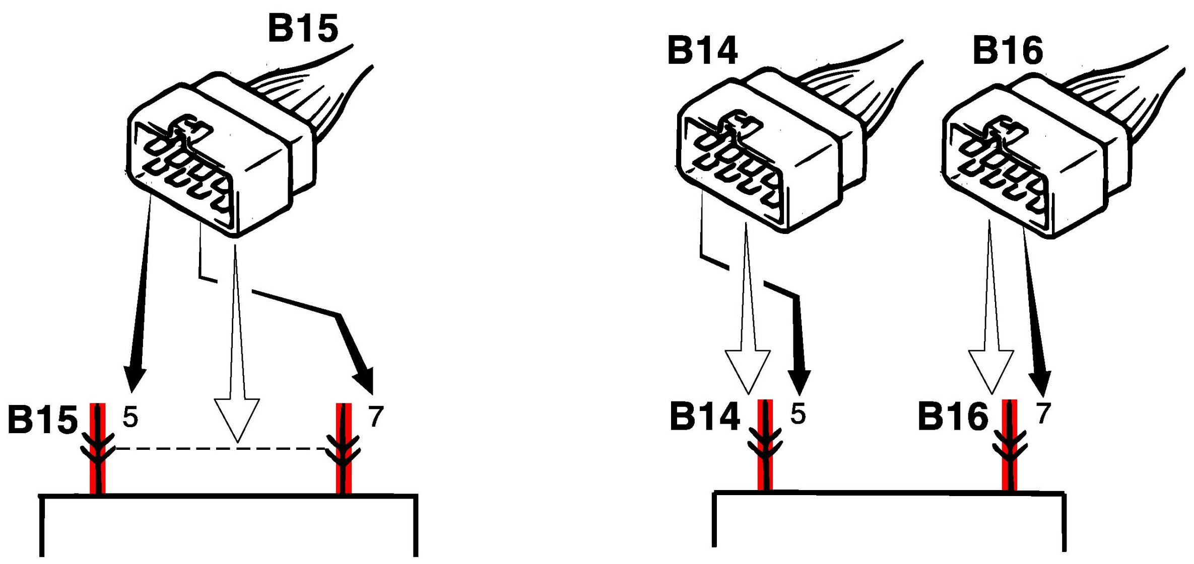 3. Terminals in one connector (Broken line) (B15)/Terminals in different connectors (B14, B16)