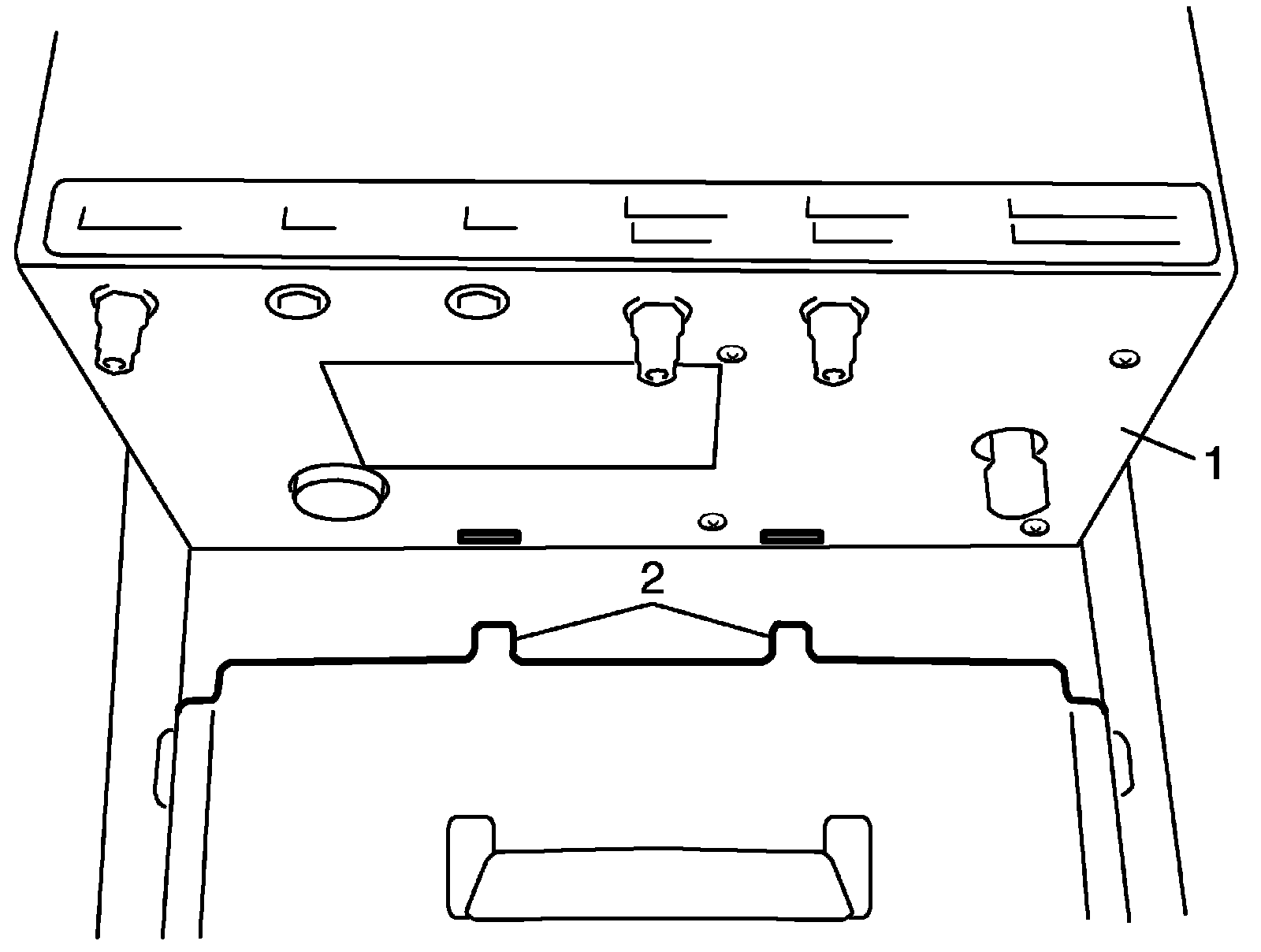 2. Bring the tester (1) up through the EVAP cart's handlebar, and place it on the two tabs (2) located on the bracket on the EVAP cart.