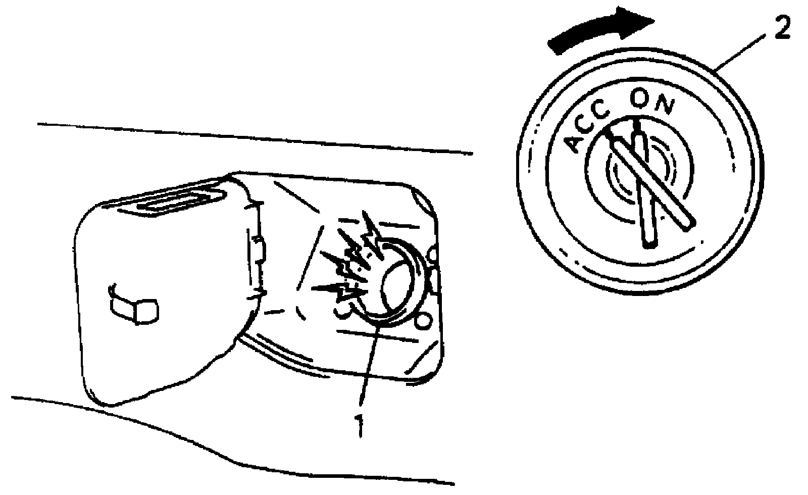 1. Remove filler cap and turn ON ignition switch (2). Then fuel pump operating sound should heard from fuel filler (1) for about 2 sec. and stop. Be sure to reinstall fuel filler cap after checking.
