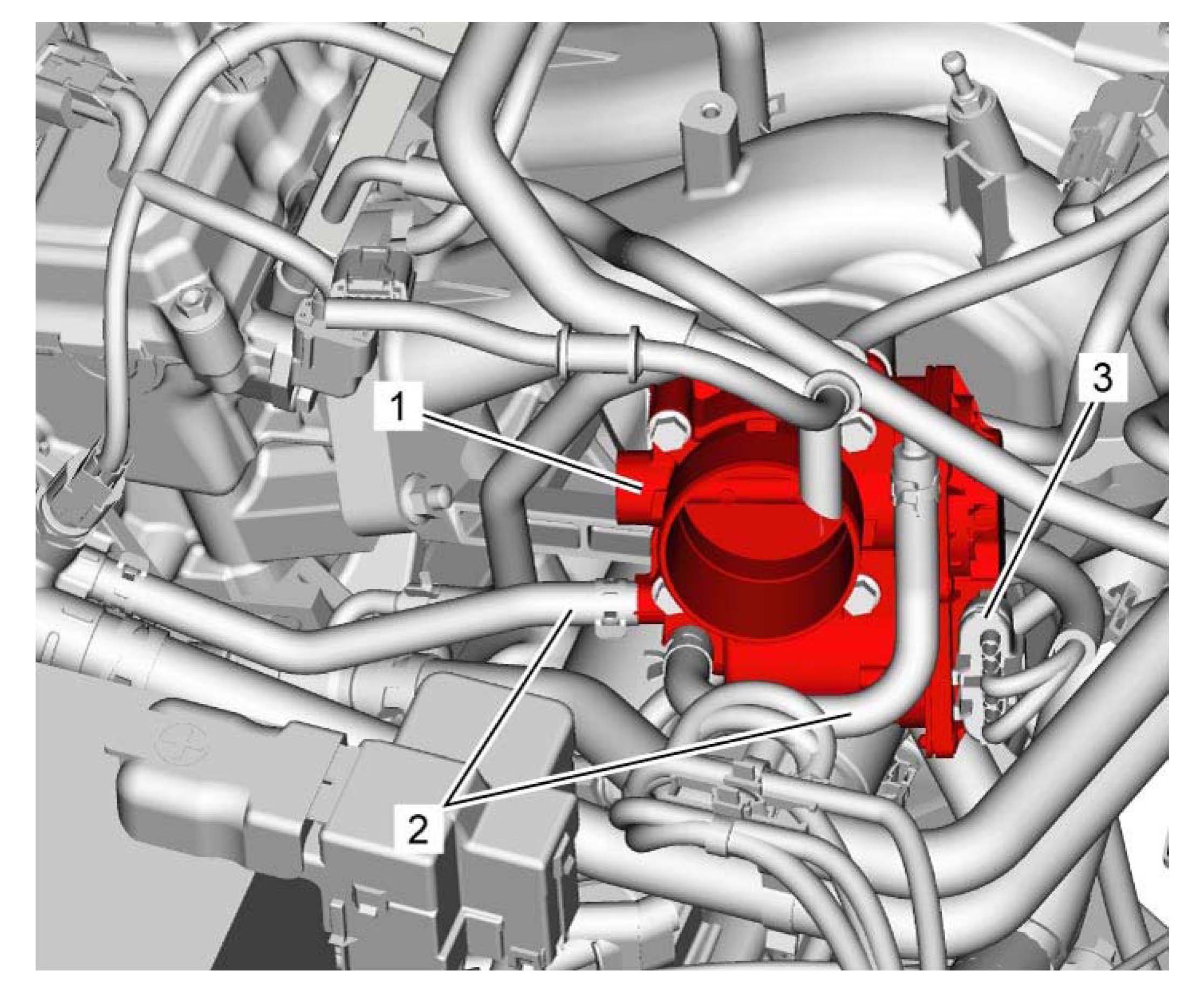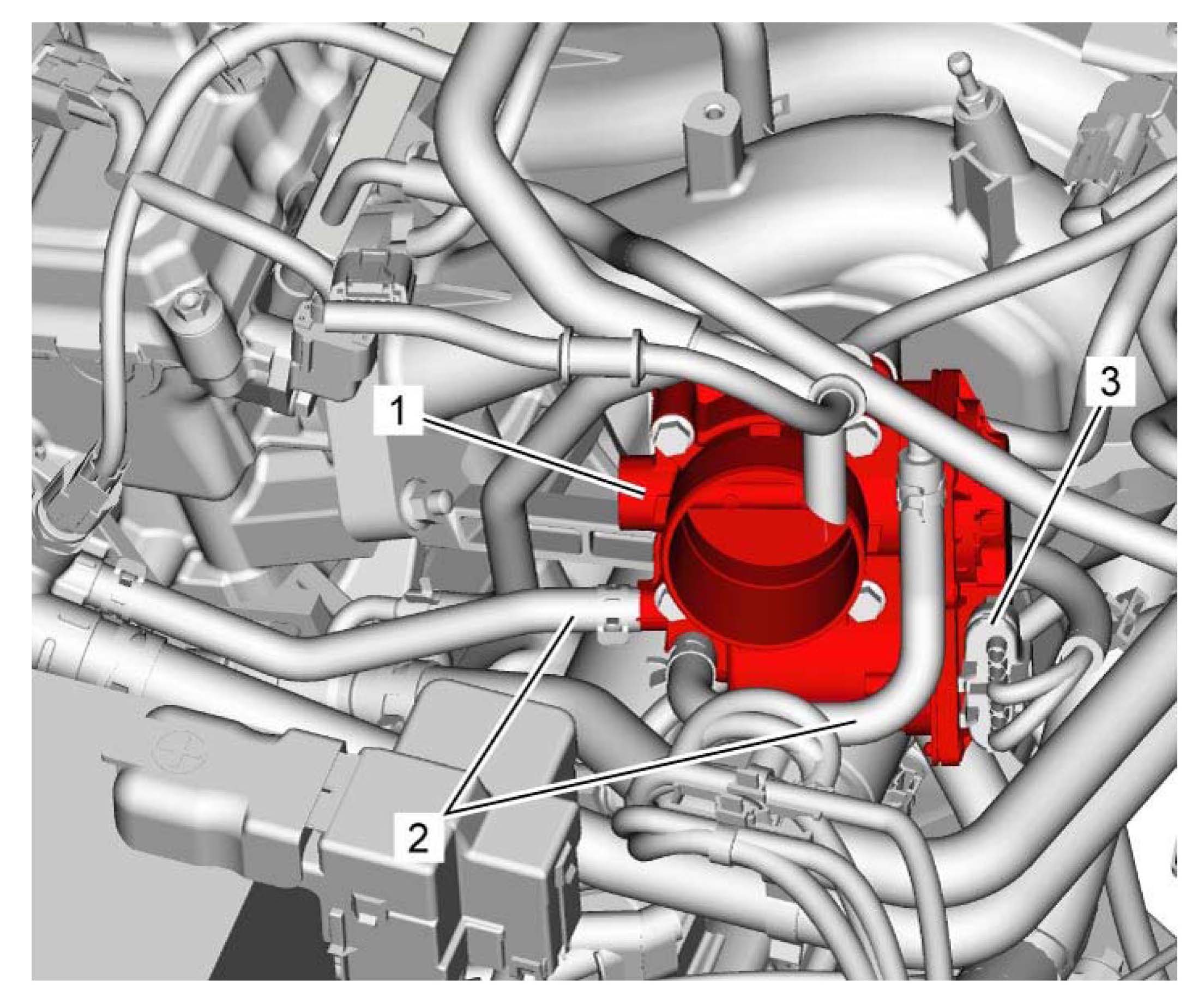 3) Connect electric connector (3) and coolant hoses (2) to throttle body assembly (1).