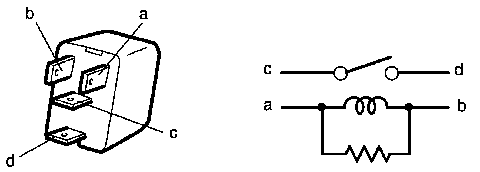 5. Check that there is continuity between terminals "c" and "d" when a 12 V battery is connected to terminals "a" and "b". If malfunction is found, replace it with a new one.