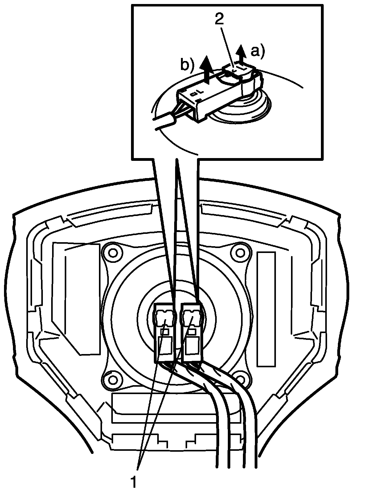 1. Connect driver air bag (inflator) module connector (1) to driver air bag (inflator) module (2) securely as shown in the figure.