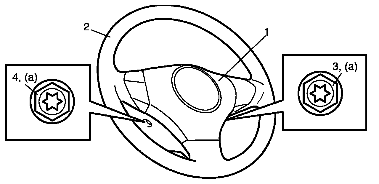 4. Tighten left side bolt (3) of driver air bag (inflator) module first and then right side bolt (4).