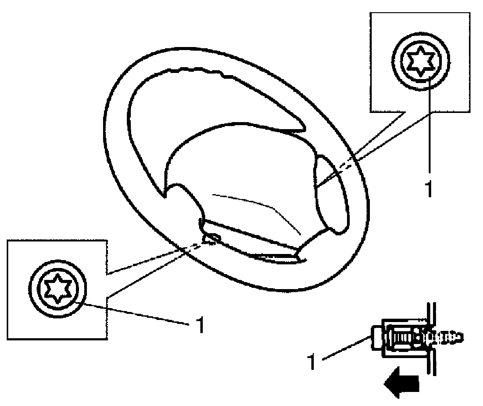 3. Loosen driver air bag (inflator) module mounting bolts (1) till it turns freely, pull them out and fix them to bolt clamps.