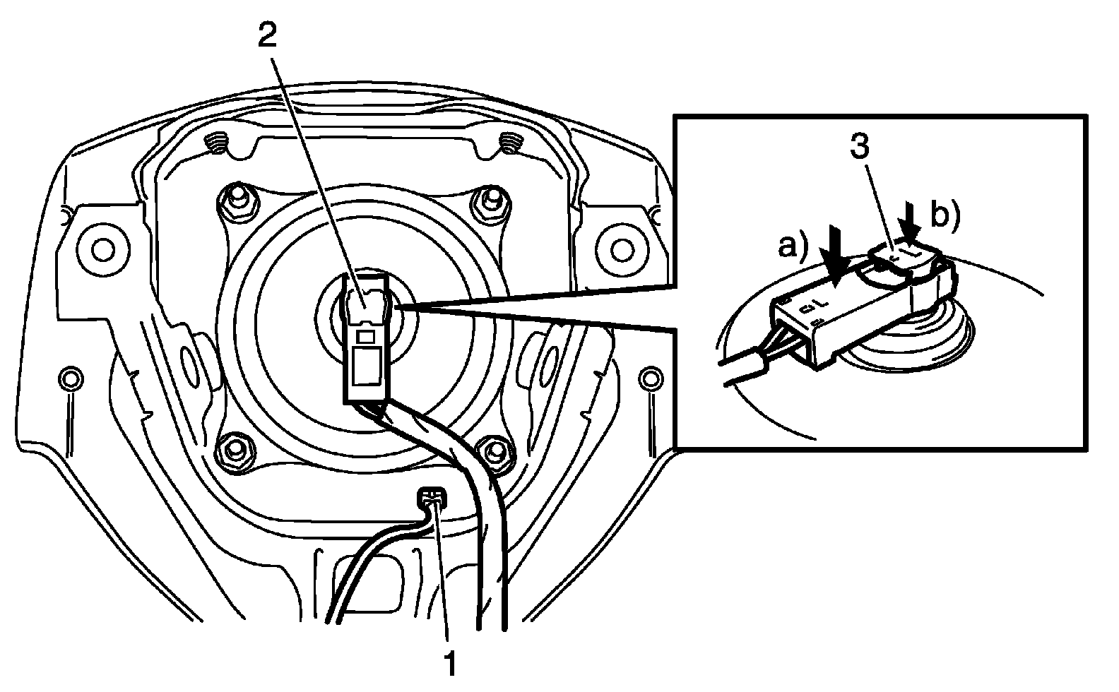 2. Connect driver air bag (inflator) module connector (2) to driver air bag (inflator) module (3) securely as shown in figure.