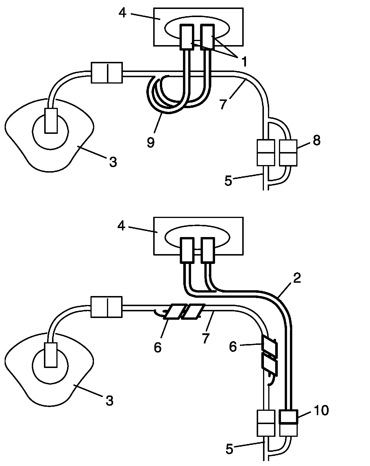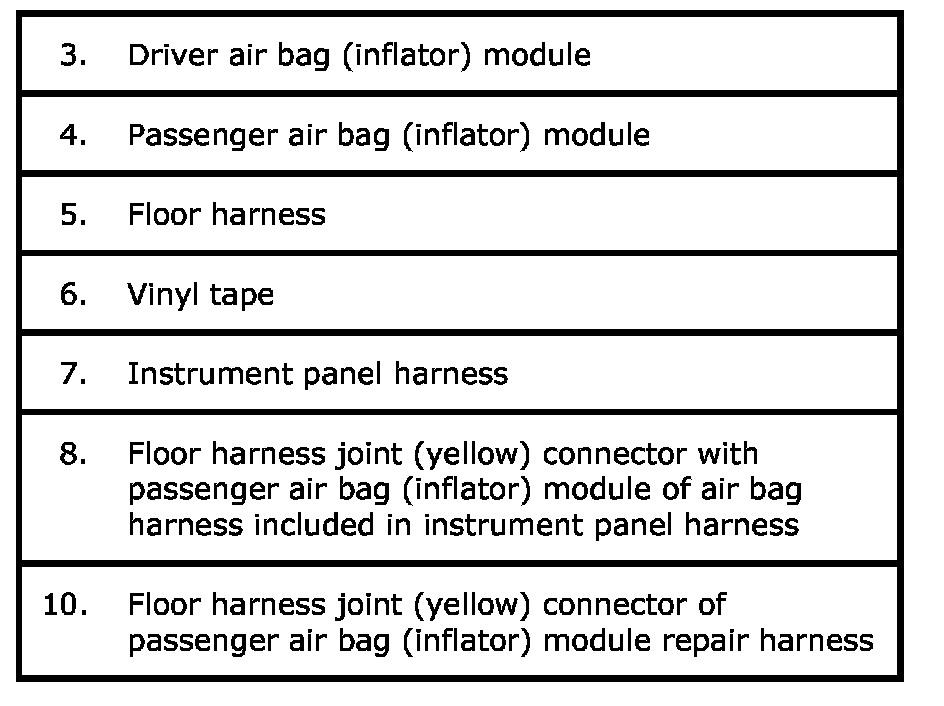 Passenger Air Bag (Inflator) Module Repair Harness InstallationReplace passenger air bag (inflator) module repair harness (2) according to the following procedure when the harness (9) connected with passenger air bag (inflator) module of the air bag harness included in instrument panel harness (7) and passenger air bag (inflator) module connector (1) is damaged.