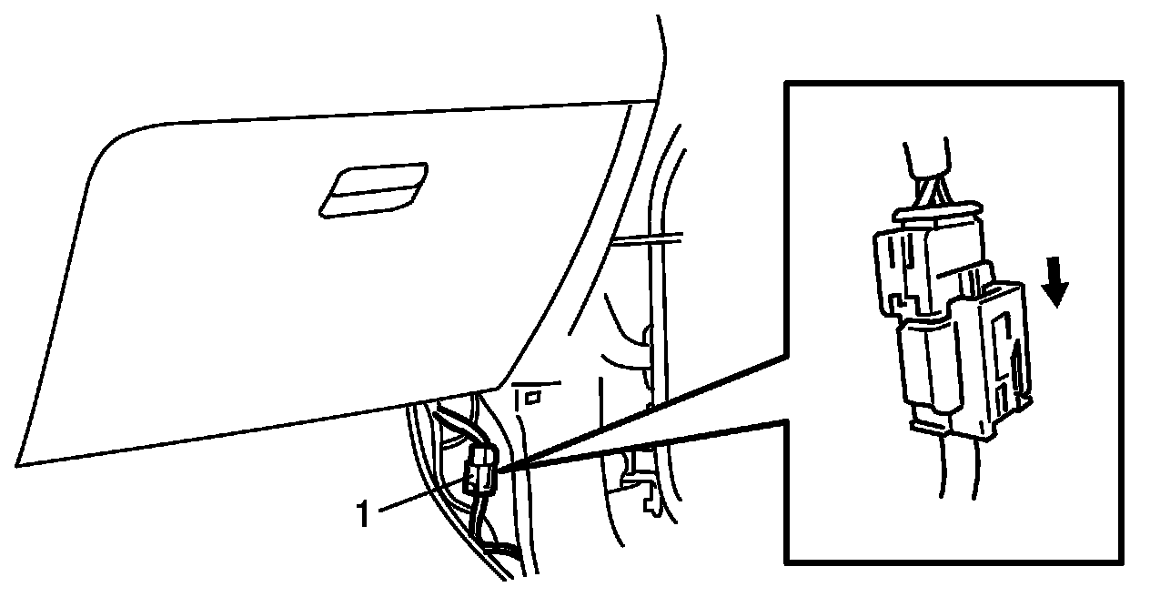 3. Disconnect floor harness joint (yellow) connector (1) with passenger air bag (inflator) module of air bag harness included in instrument panel harness from floor harness located near the glove box.