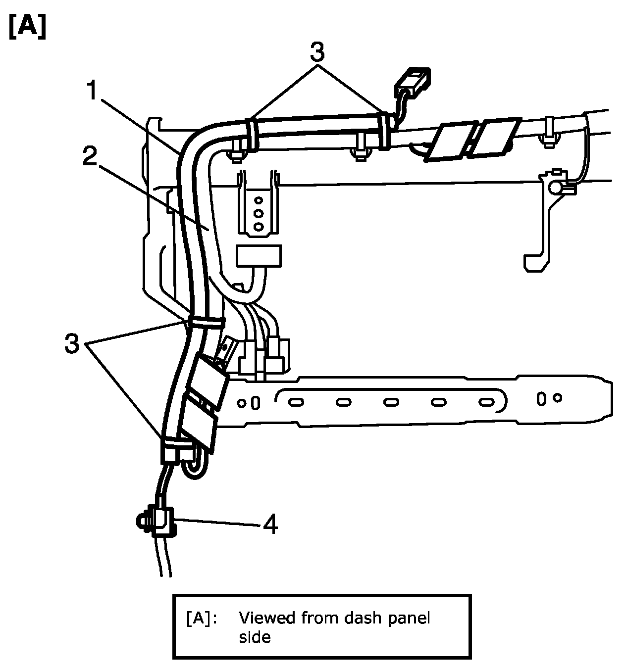 CAUTION: To avoid interference with other parts, fasten the repair harness to instrument panel harness with a clamp (3) as shown in figure.