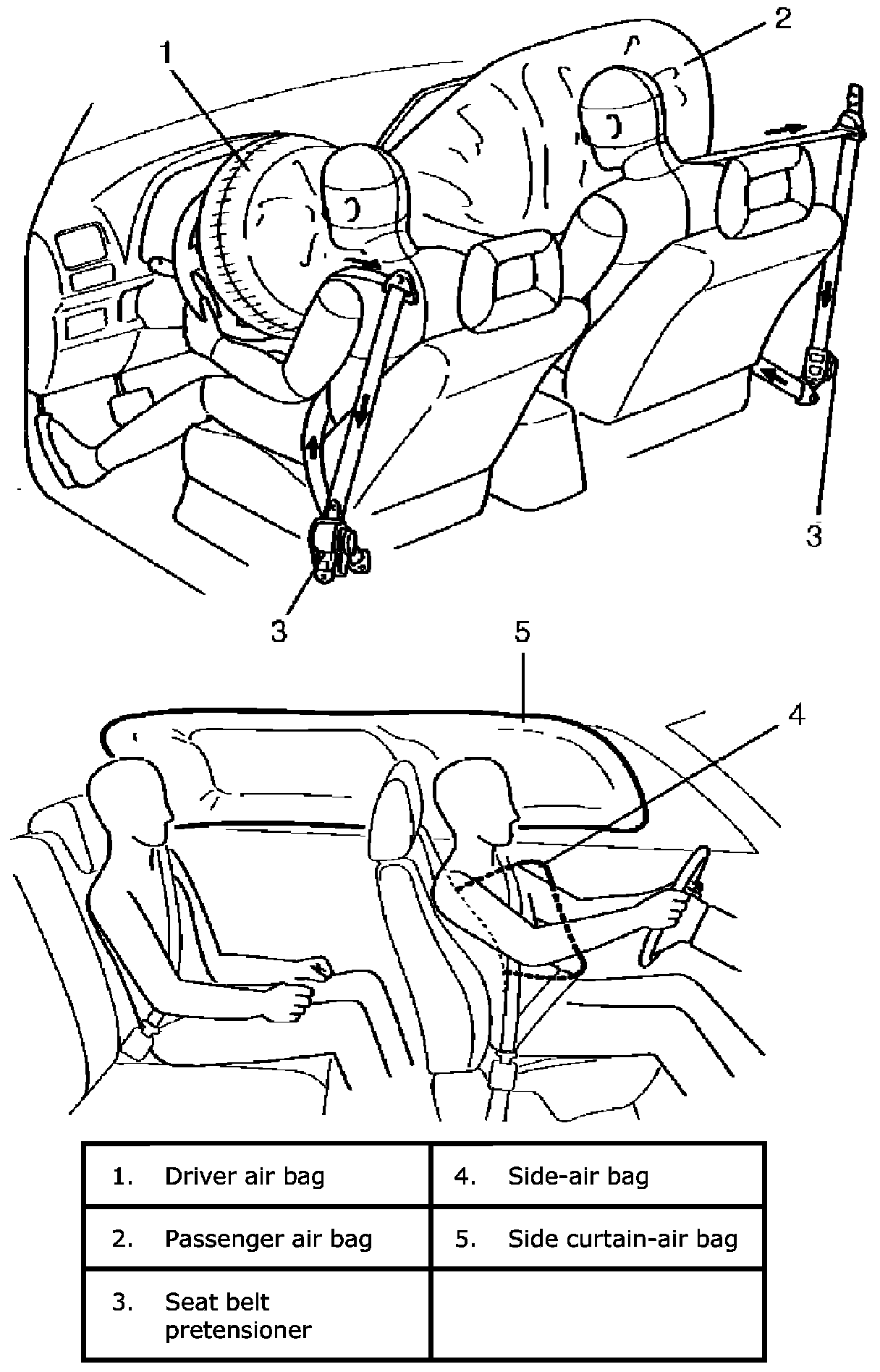 Air Bag System ConstructionWith the air bag system which includes front air bags, side curtain-air bag and side-air bags for both the driver's and passenger's sides as well as the seat belt pretensioners, the sag of the seat belt is taken up (for seat belt with pretensioner), the driver air bag (inflator) module is deployed from the center of the steering column and the passenger air bag (inflator) module from the top of the instrument panel in front of the front passenger seat in occurrence of a front collision with an impact larger than a certain set value to supplement protection offered by the driver and front passenger seat belts.