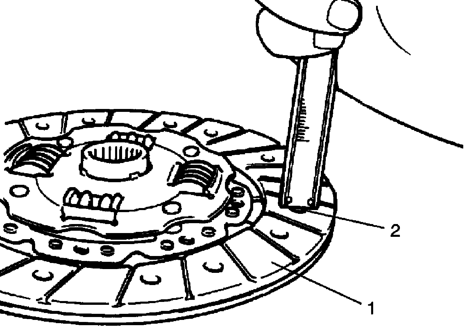 If depression is found to have reached service limit at any of rivet holes (2), replace clutch disc assembly (1).