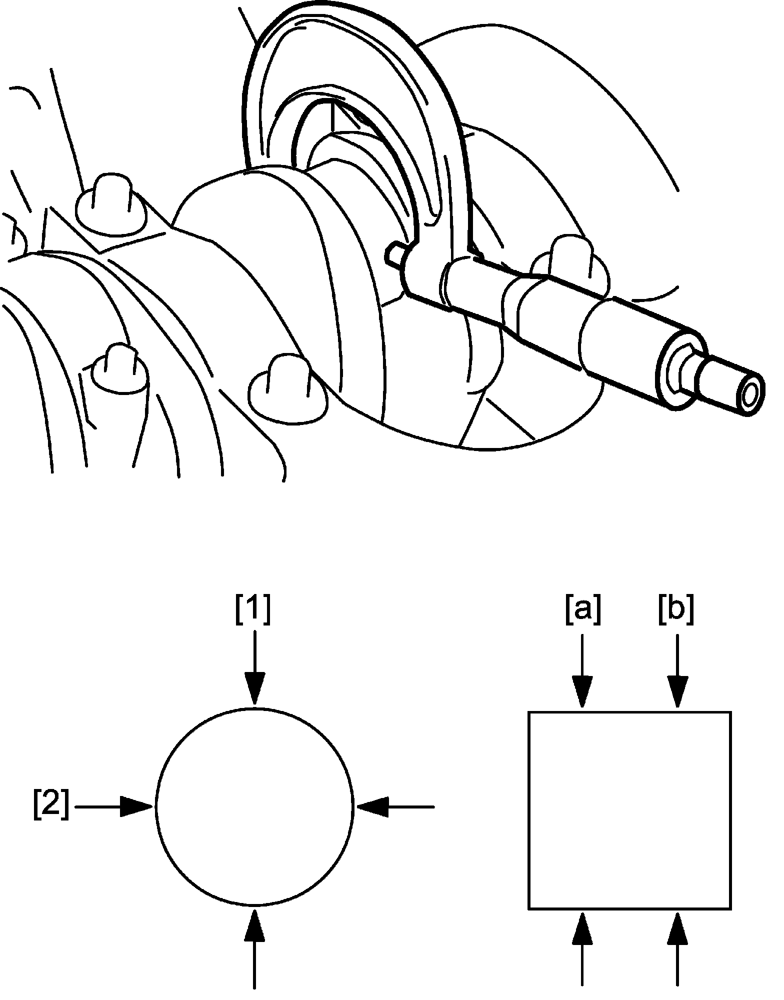 Crankshaft pin taper ([a] -[b]) and out-of-round ([1] - [2])
