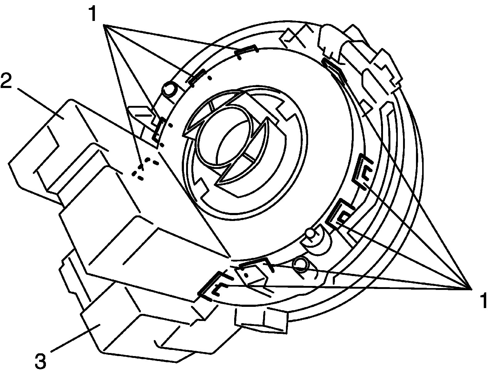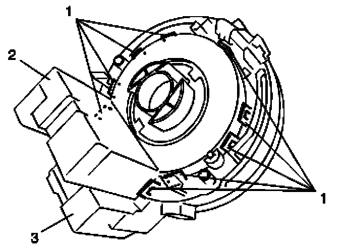 2) Remove steering angle sensor (2) from contact coil cable assembly (3) while opening fitting parts (1) of contact coil cable assembly.