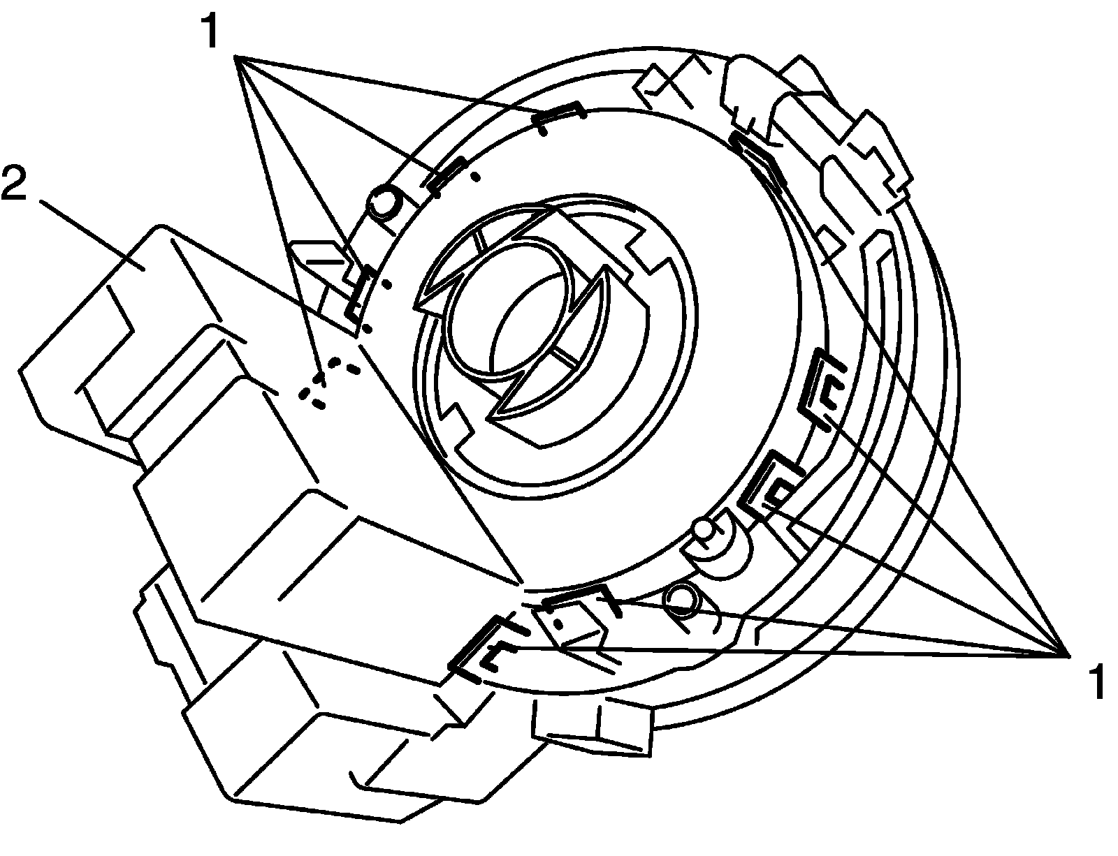 1) Install steering angle sensor (2) by fitting engagement parts (1) of contact coil cable assembly to claws of steering angle sensor as shown in figure.
