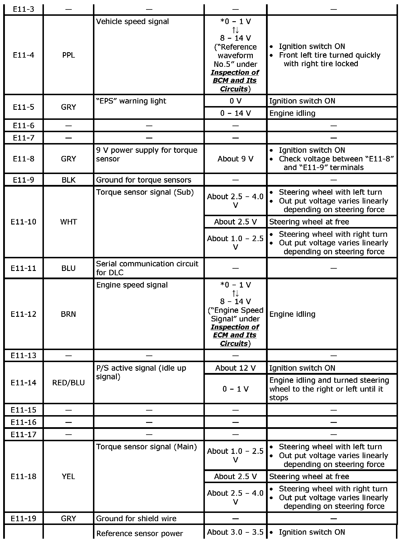 As each terminal voltage is affected by the battery voltage, confirm if the battery voltage is 11 V or more when ignition switch is ON.