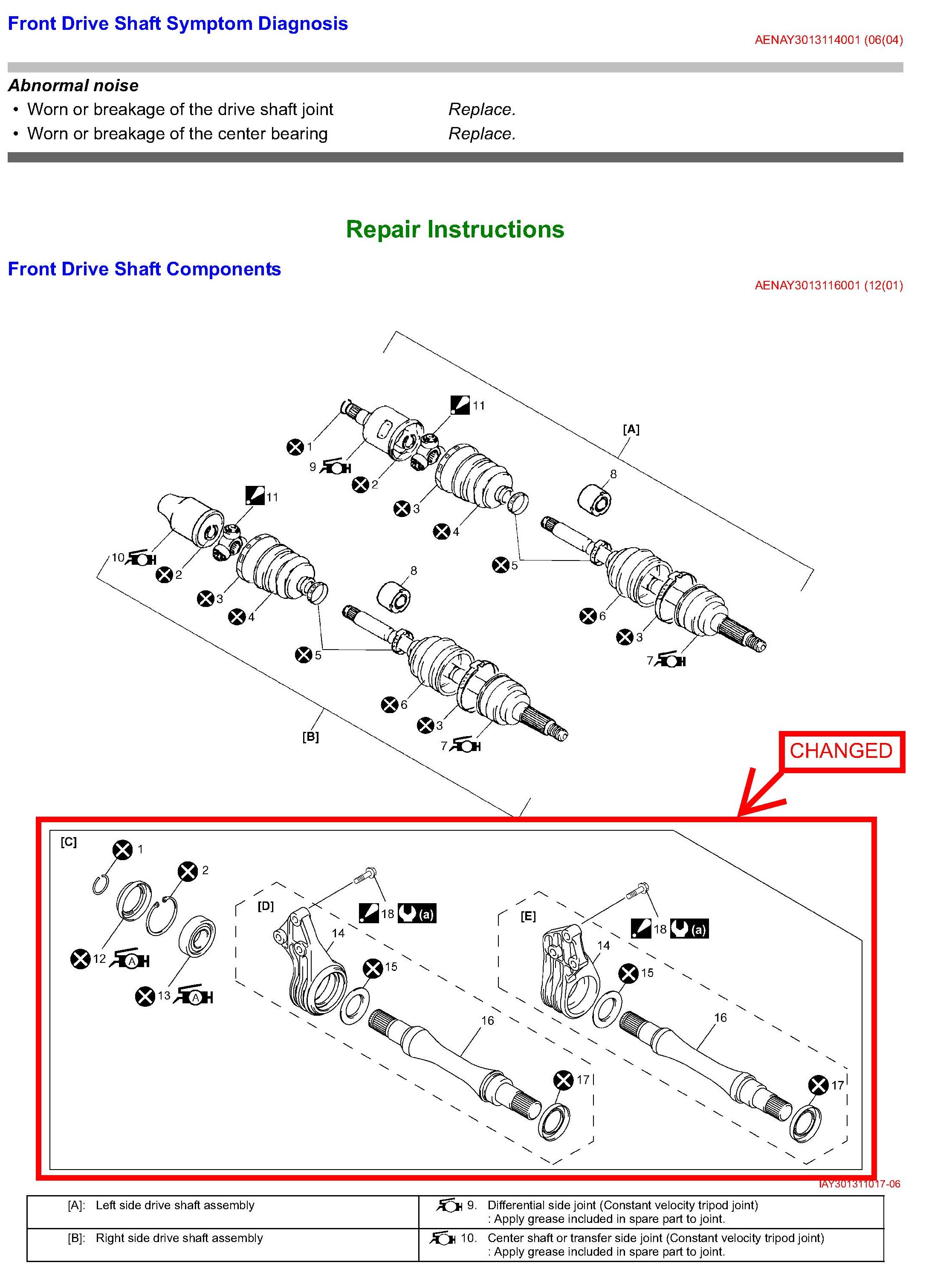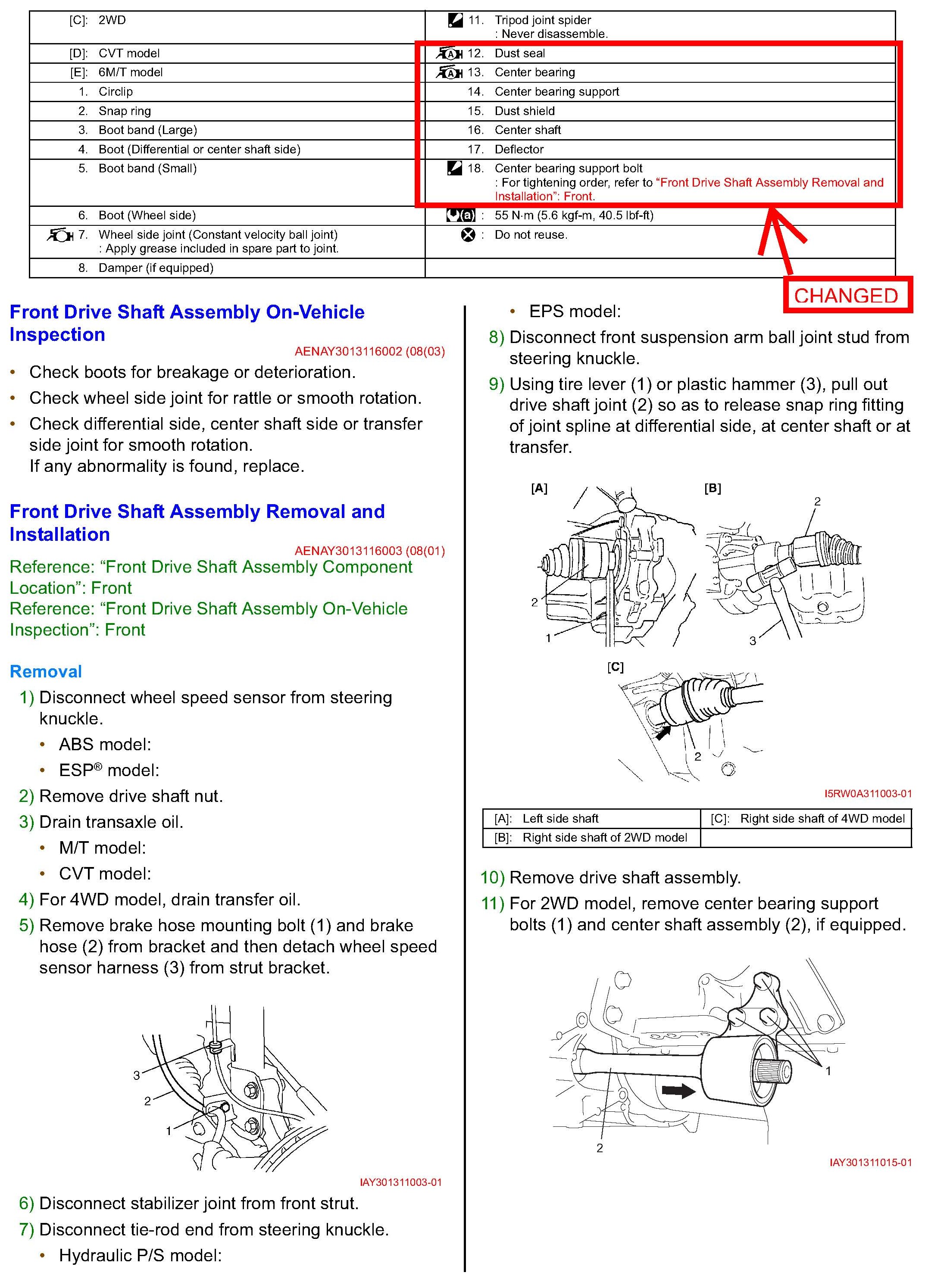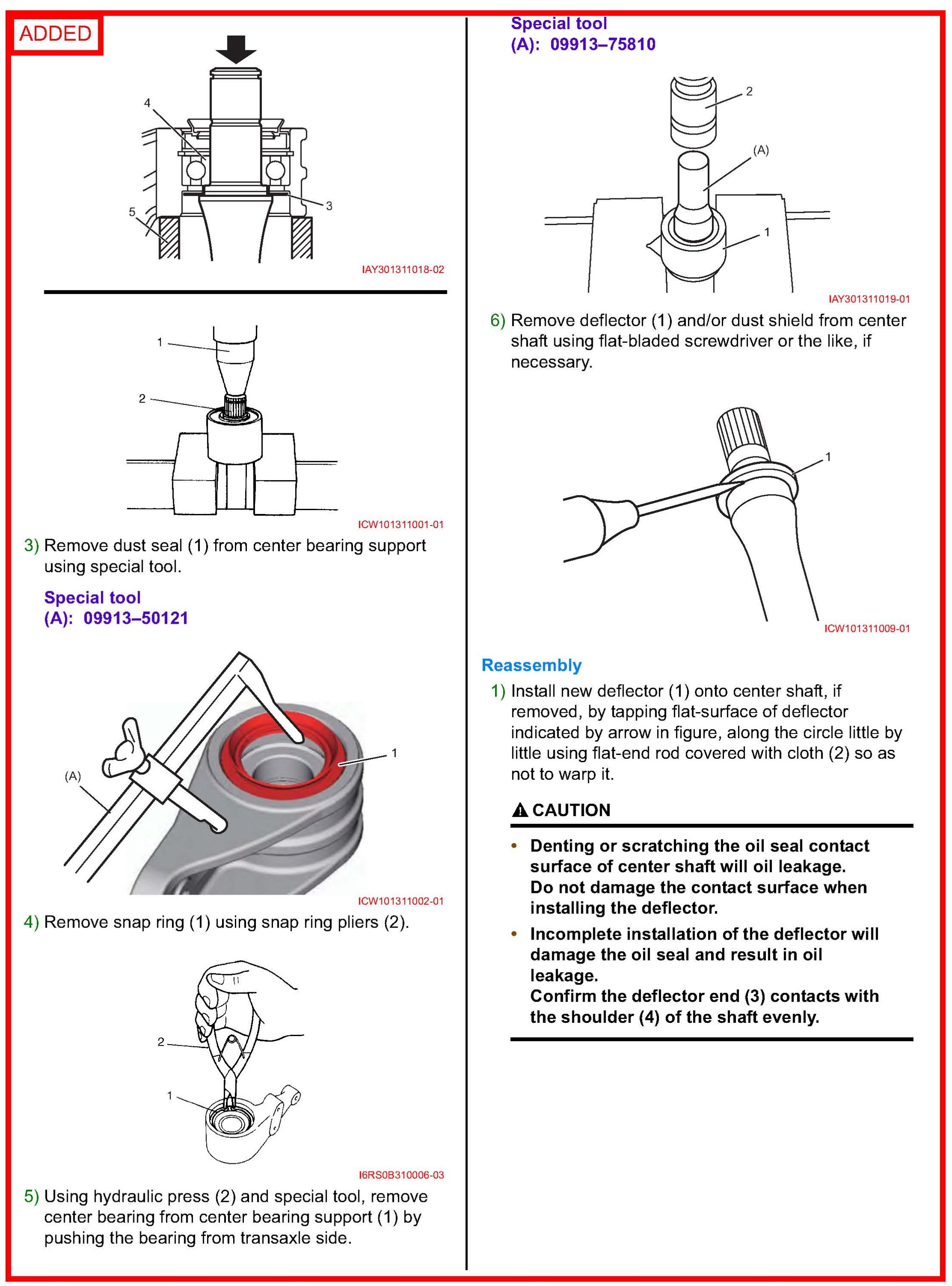 This bulletin is being provided to inform you of service manual additions for Drive Center Shaft Disassembly and Reassembly Procedures for drive center shafts equipped with deflector. Additions apply to 2010~2013 SX4 (RW420) Service Manuals, Section 3A for Front Drive Shaft Components and Center Shaft Assembly Disassembly and reassembly.