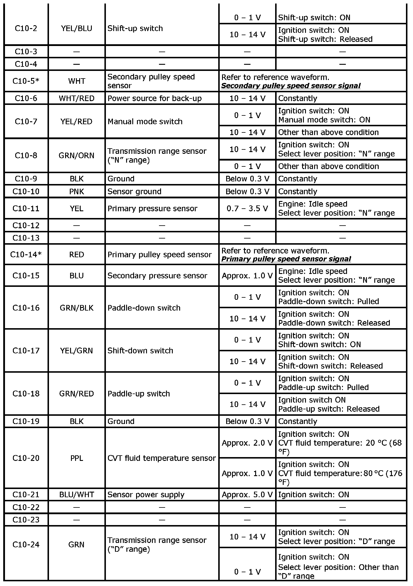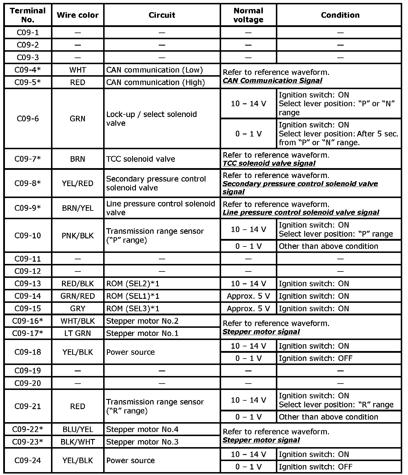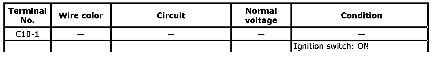 ^ As each terminal voltage is affected by battery voltage, confirm that it is 11 V or more when ignition switch is ON.