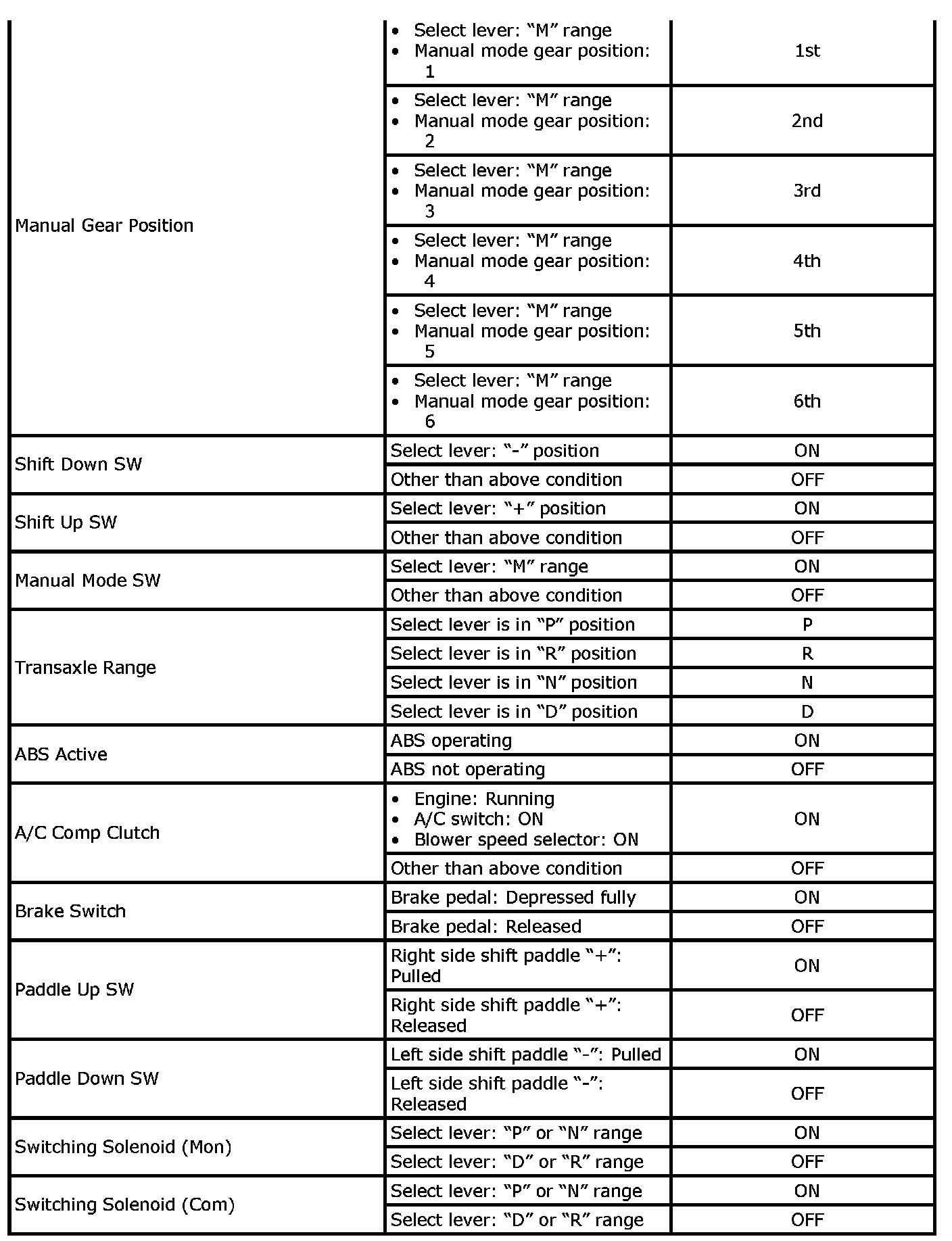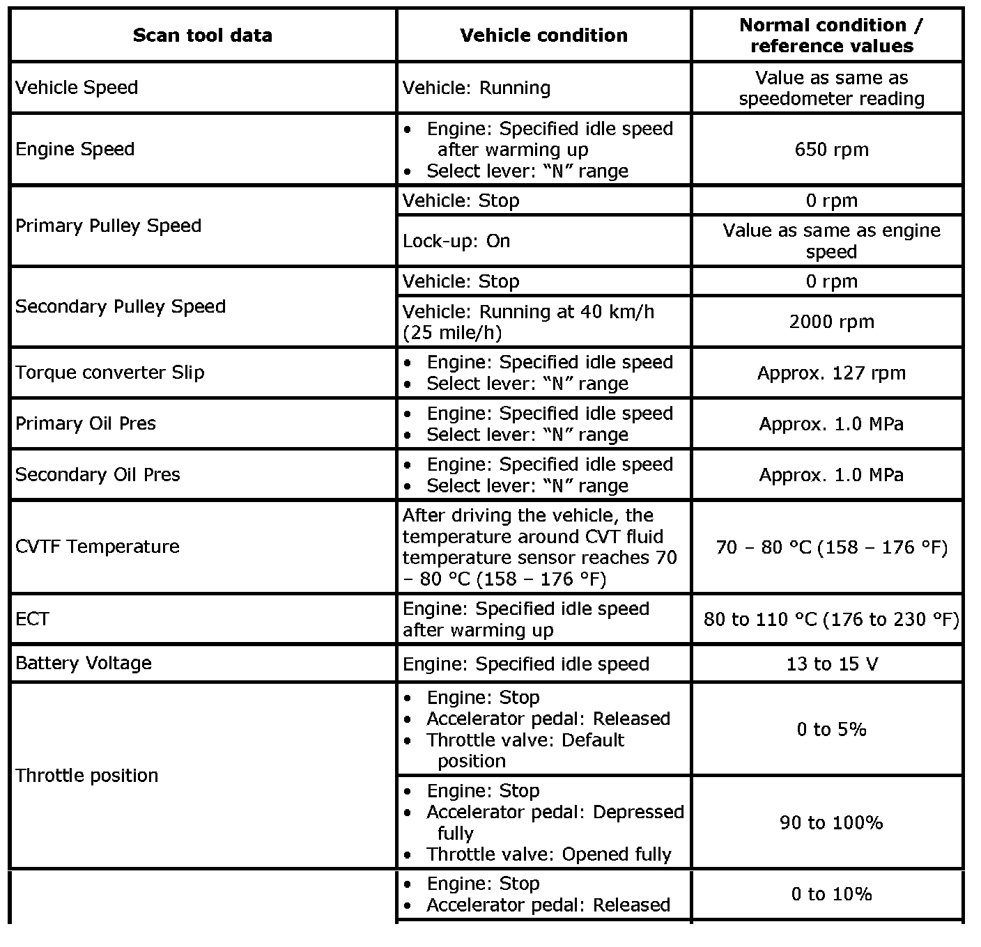 Also, condition in the following table that can be checked by the scan tool are those detected by TCM and output from TCM as commands and there may be cases where the CVT or actuator is not operating (in the condition) as indicated by the scan tool.