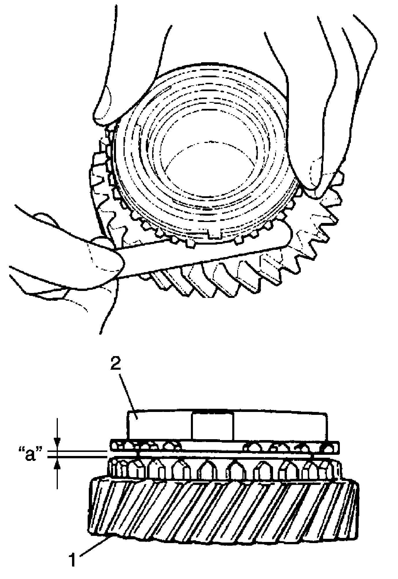 ^ Check clearance "a" between synchronizer ring (1) and gear (2) while lightly pushing synchronizer ring by hand, and also check chamfered tooth of synchronizer outer ring.