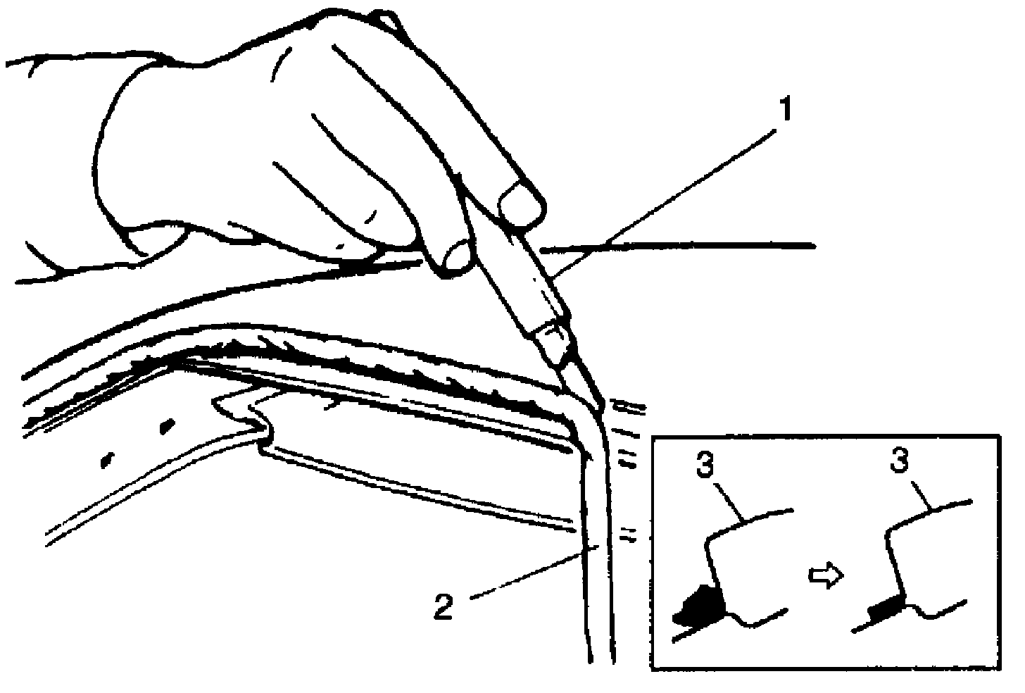 10 Using knife (1), smoothen adhesive (2) remaining on body side (3) so that it is 1 - 2 mm (0.040 - 0.078 in.) thick all around.